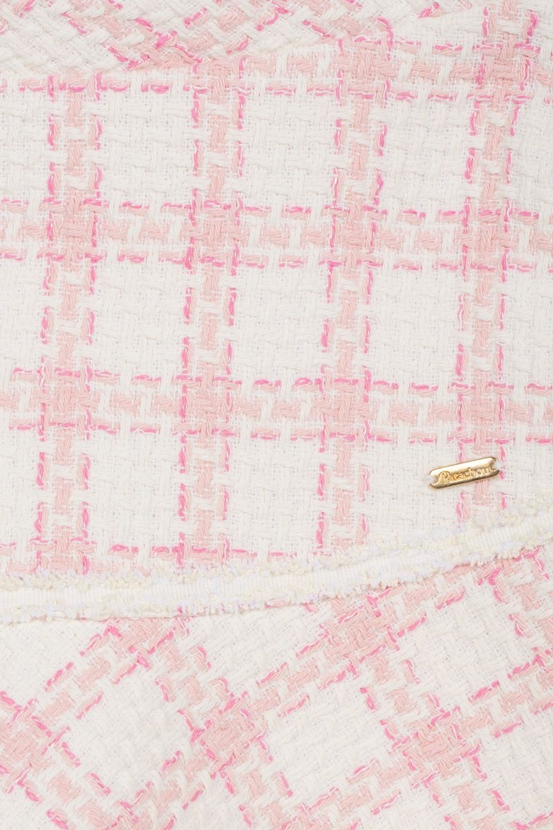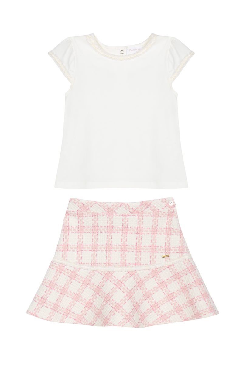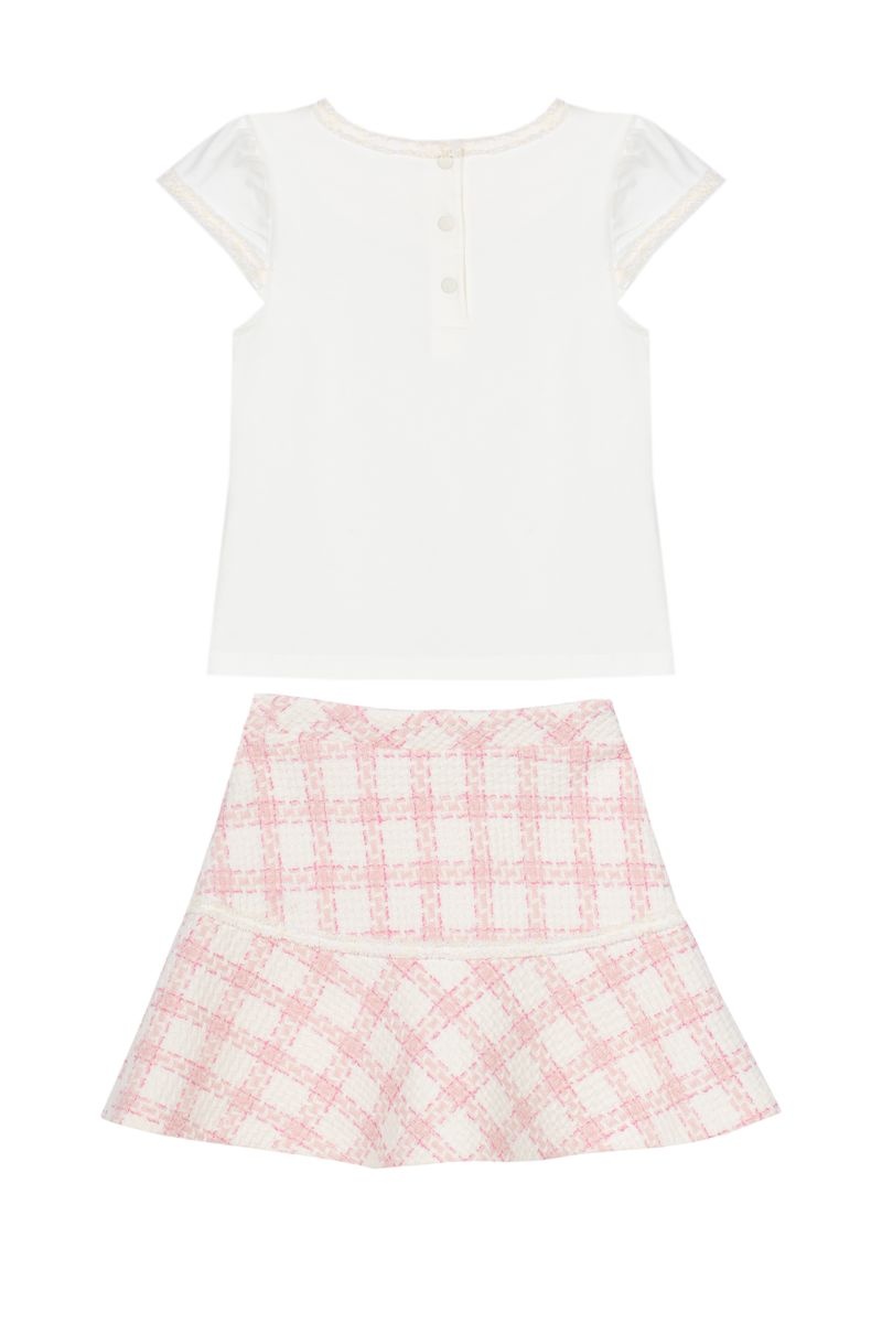 • Two-piece white and pink set including a white short-sleeved top and a pink tweed skirt with adjustable waist.