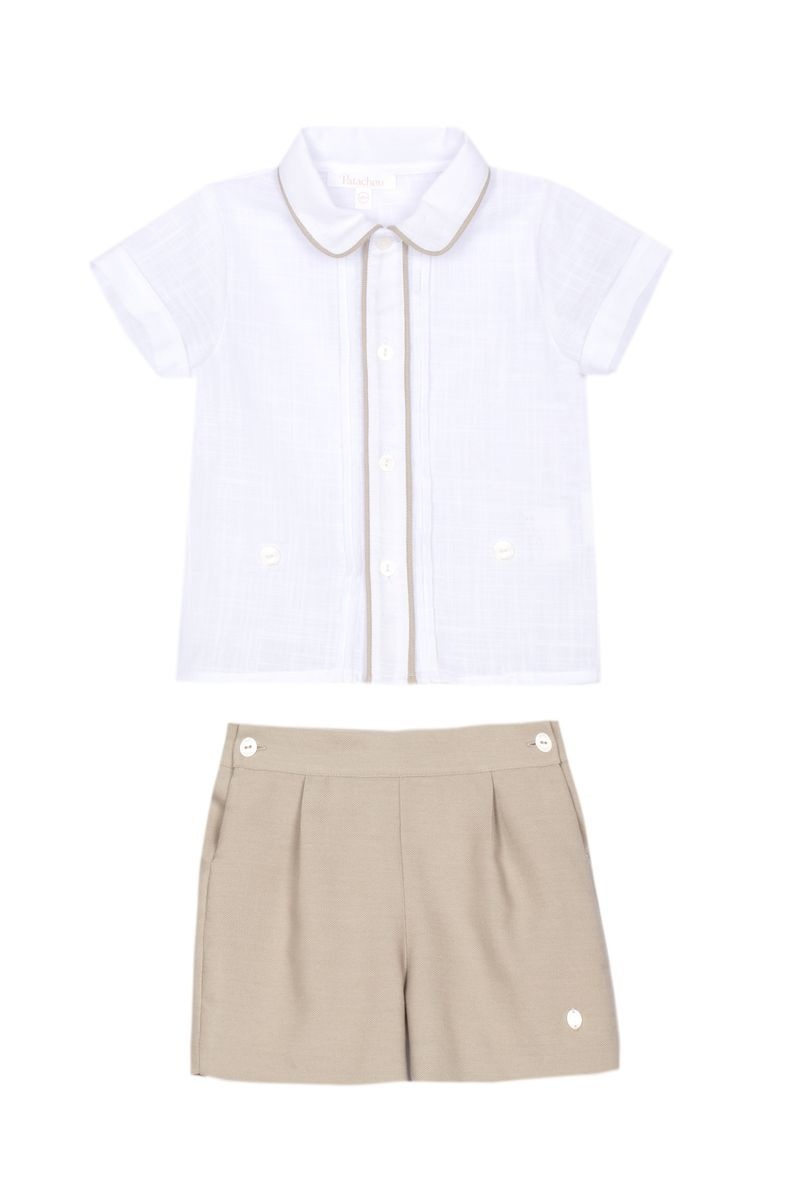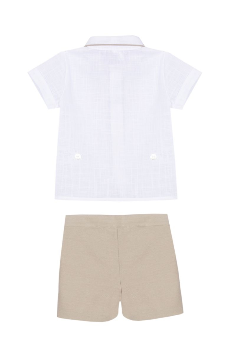 • 2-piece set including a white short-sleeved shirt and beige shorts.