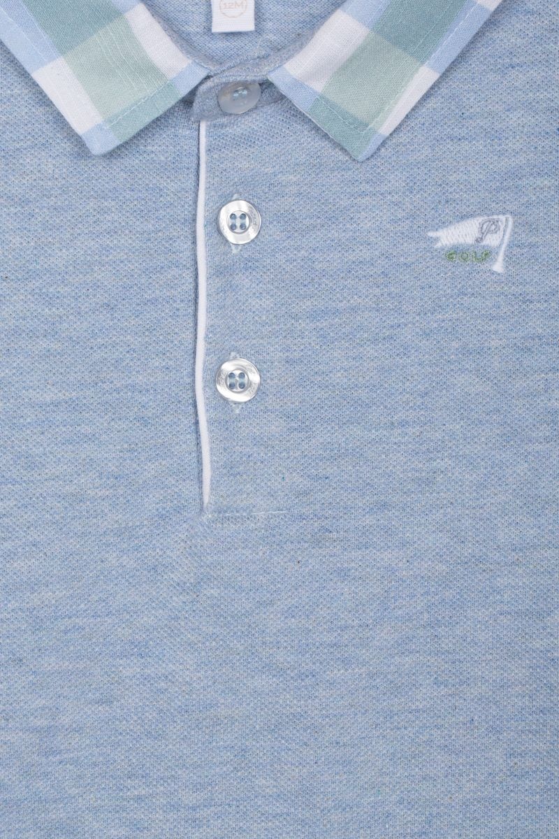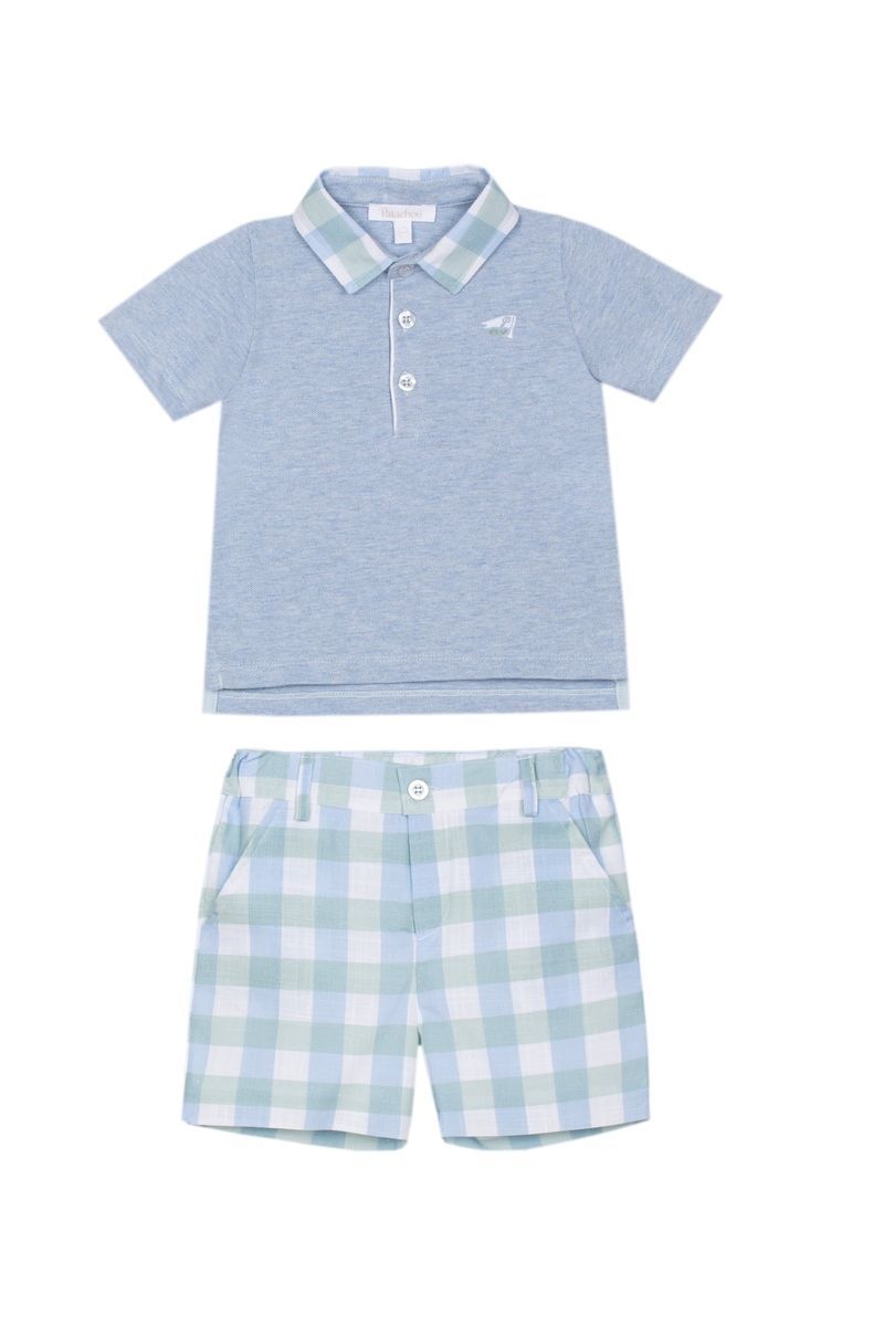 • Two-piece set including a short-sleeved blue polo shirt and plaid shorts with an adjustable waistband.