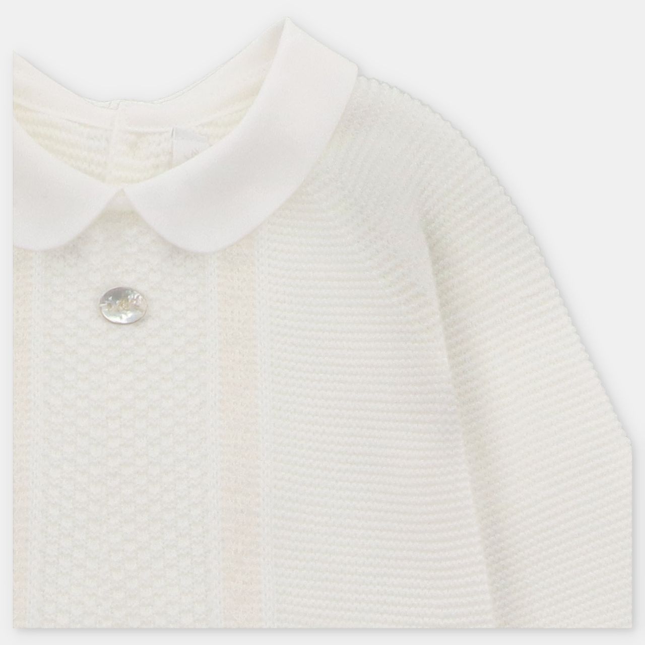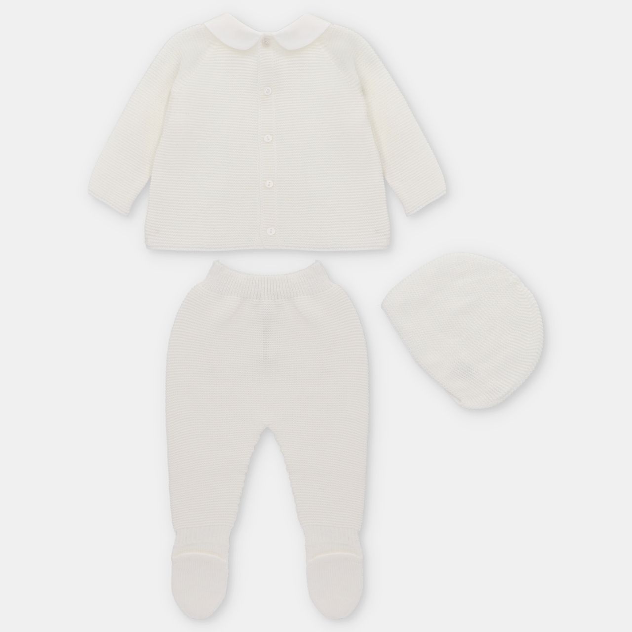 • Three-piece ecru knit set including a button-back top, flap pants, and a bonnet.