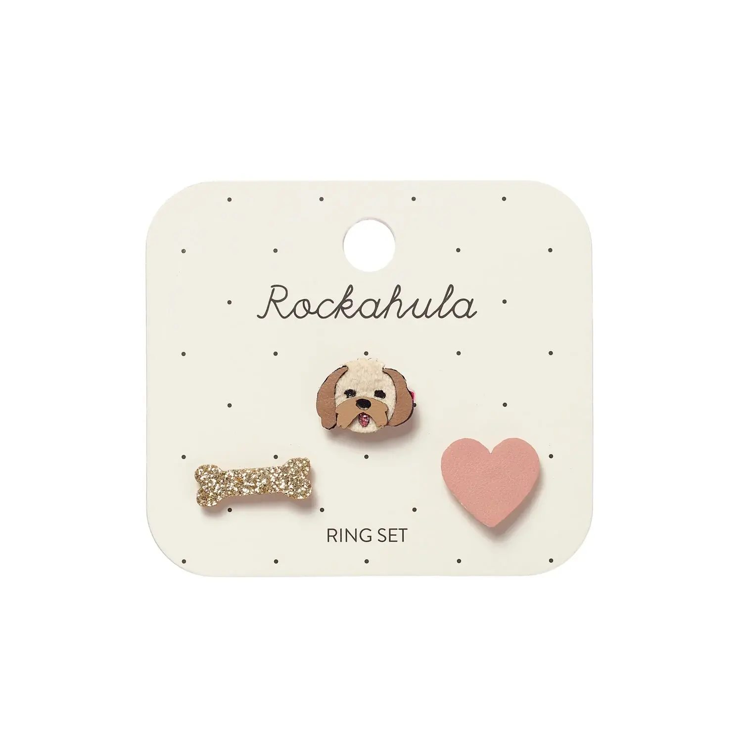 • Set of 3 adjustable rings featuring an adorable little Shih Tzu puppy, a glittery gold bone, and a pink heart.