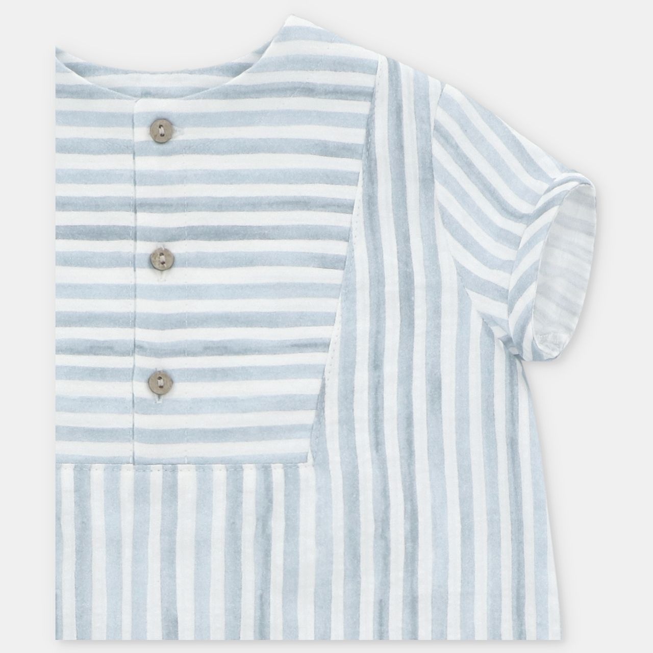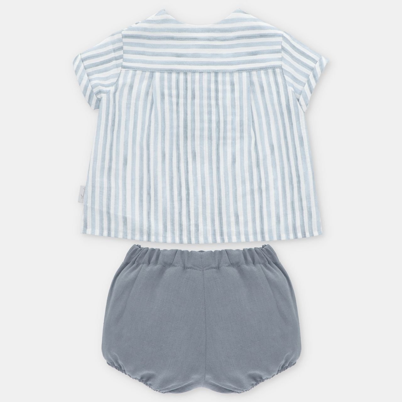 • 2-piece set including a short-sleeved striped shirt and blue bloomers.