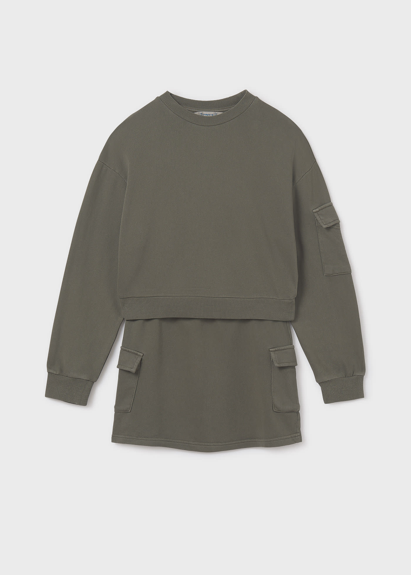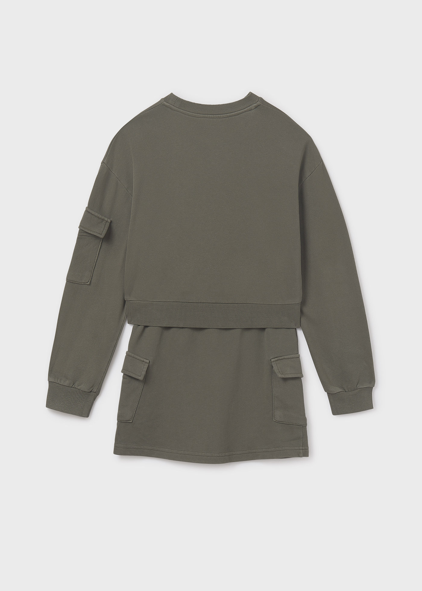 • Olive-colored two-piece set including an elastic-waisted skirt and a long-sleeved top.