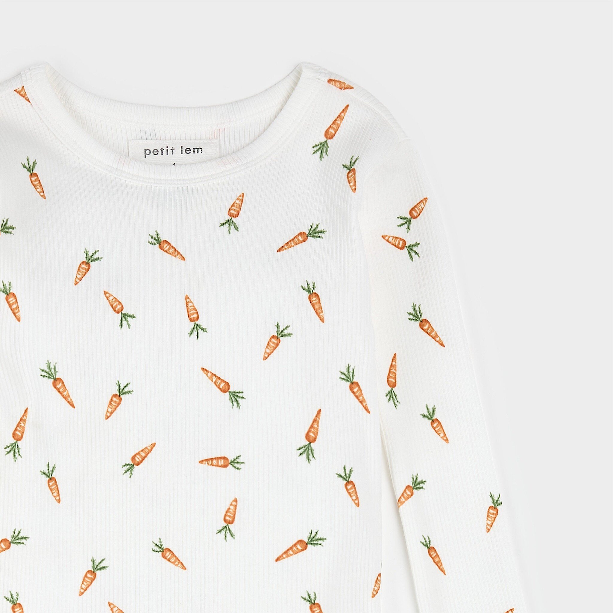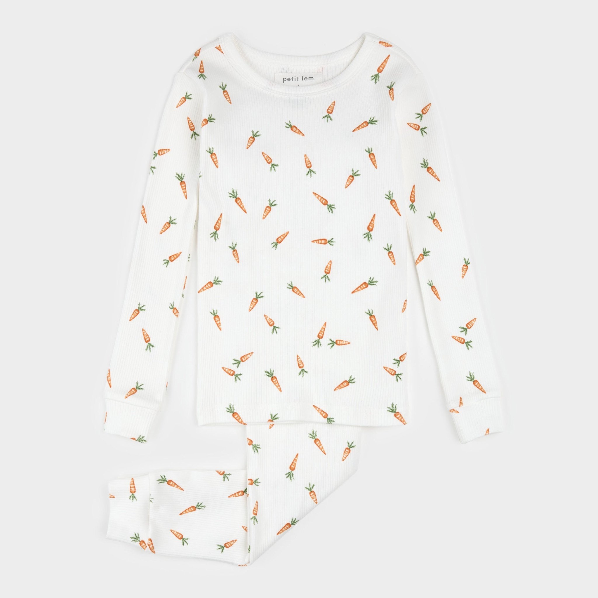 • Off-white printed pyjama set including a long-sleeved top and pants.