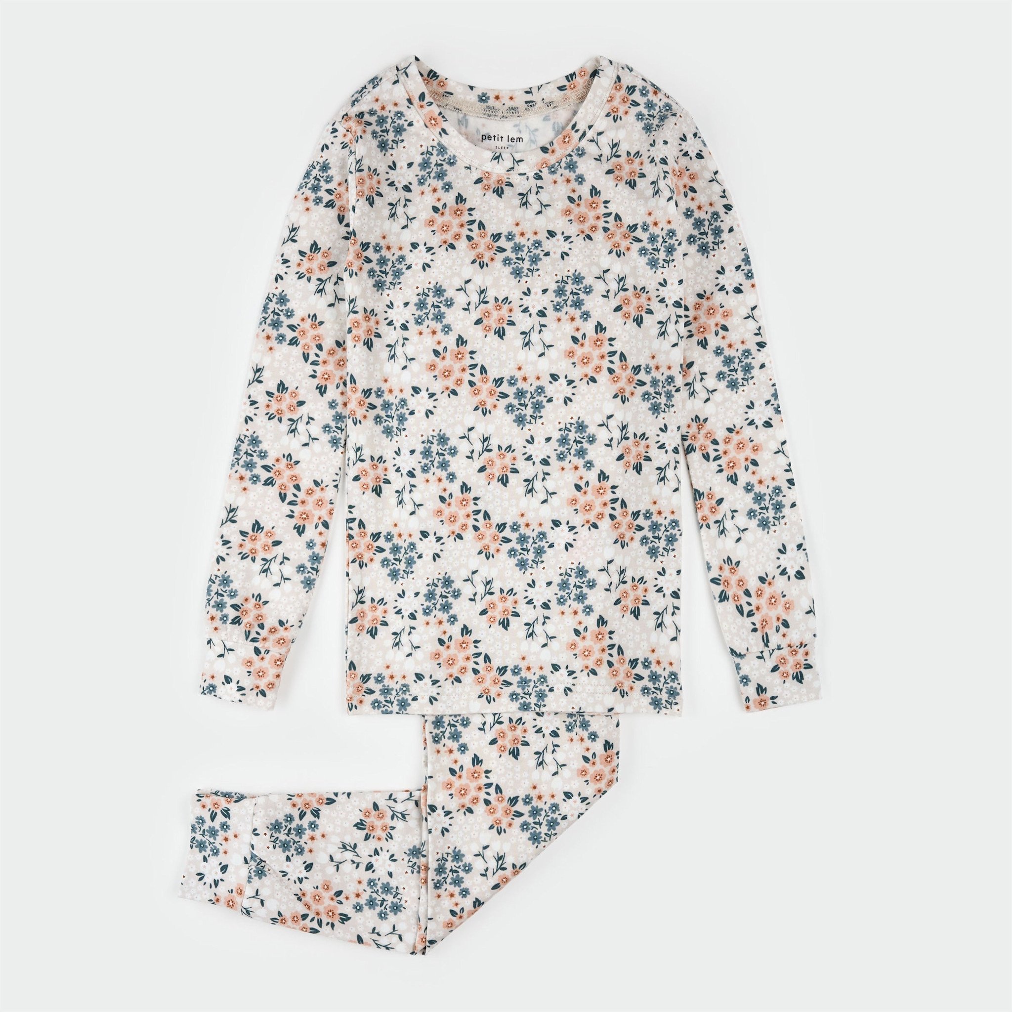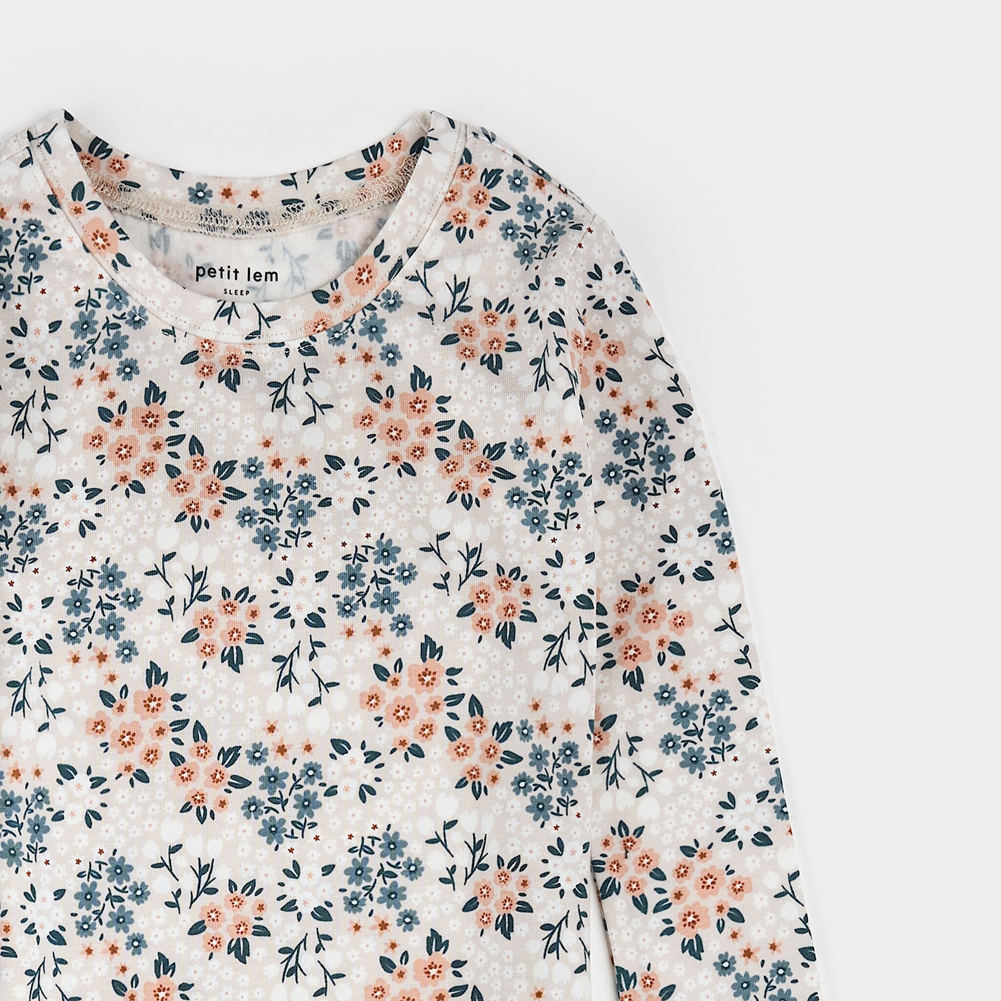 • Cream floral print pyjama set including a long-sleeved top and matching pants.