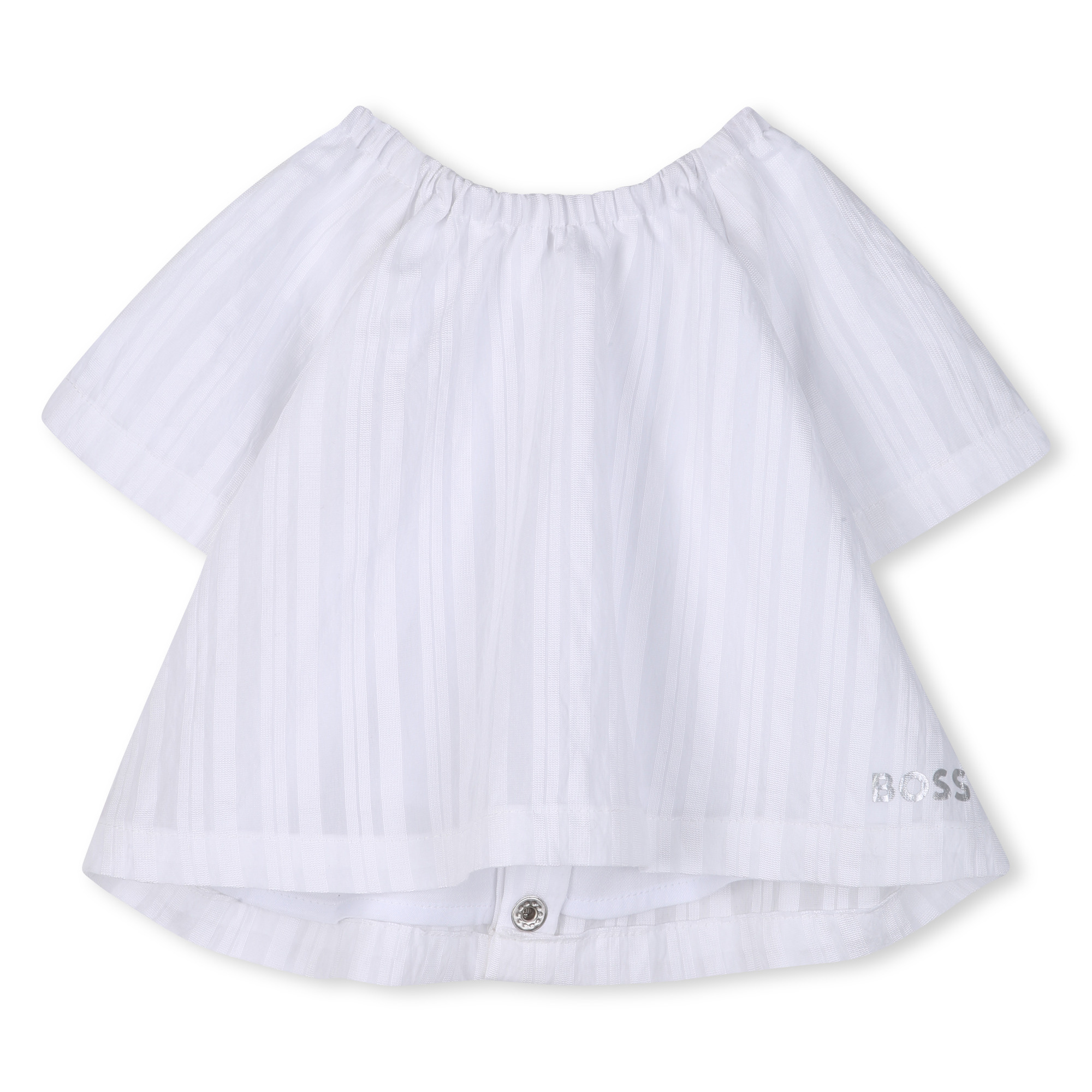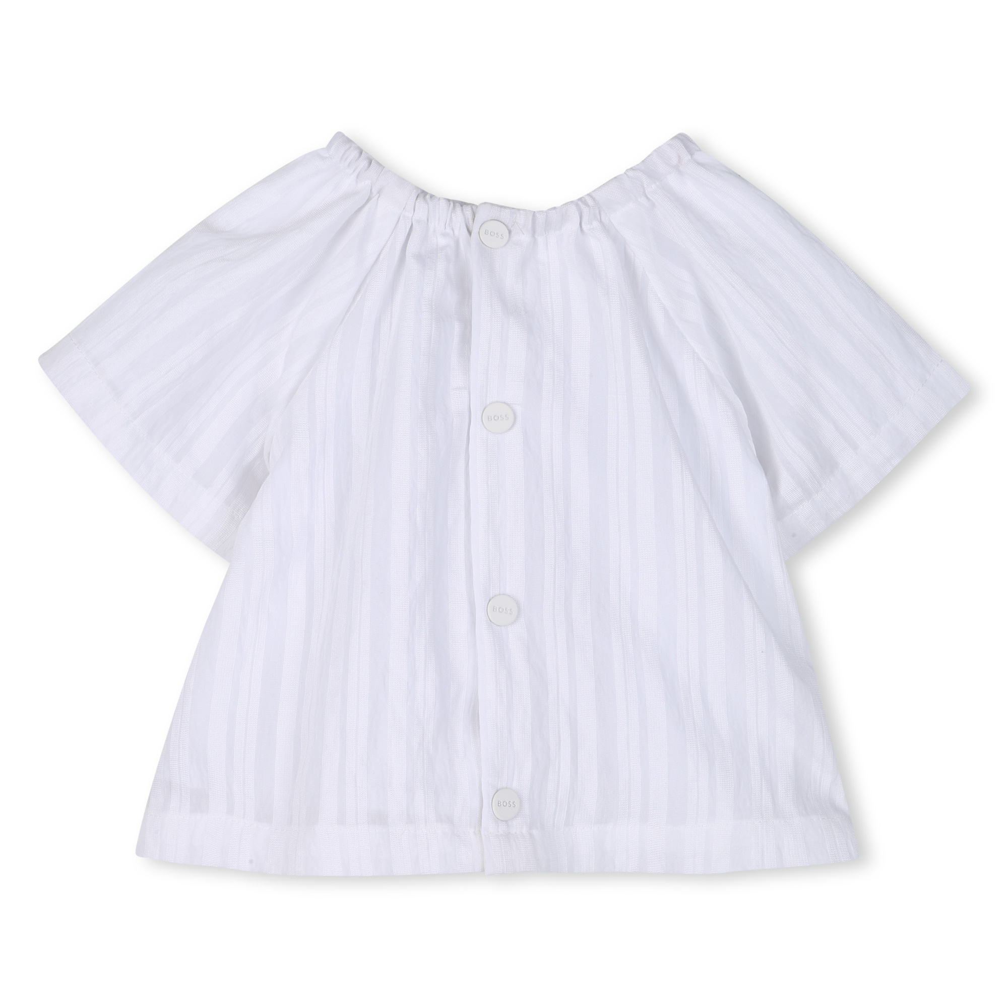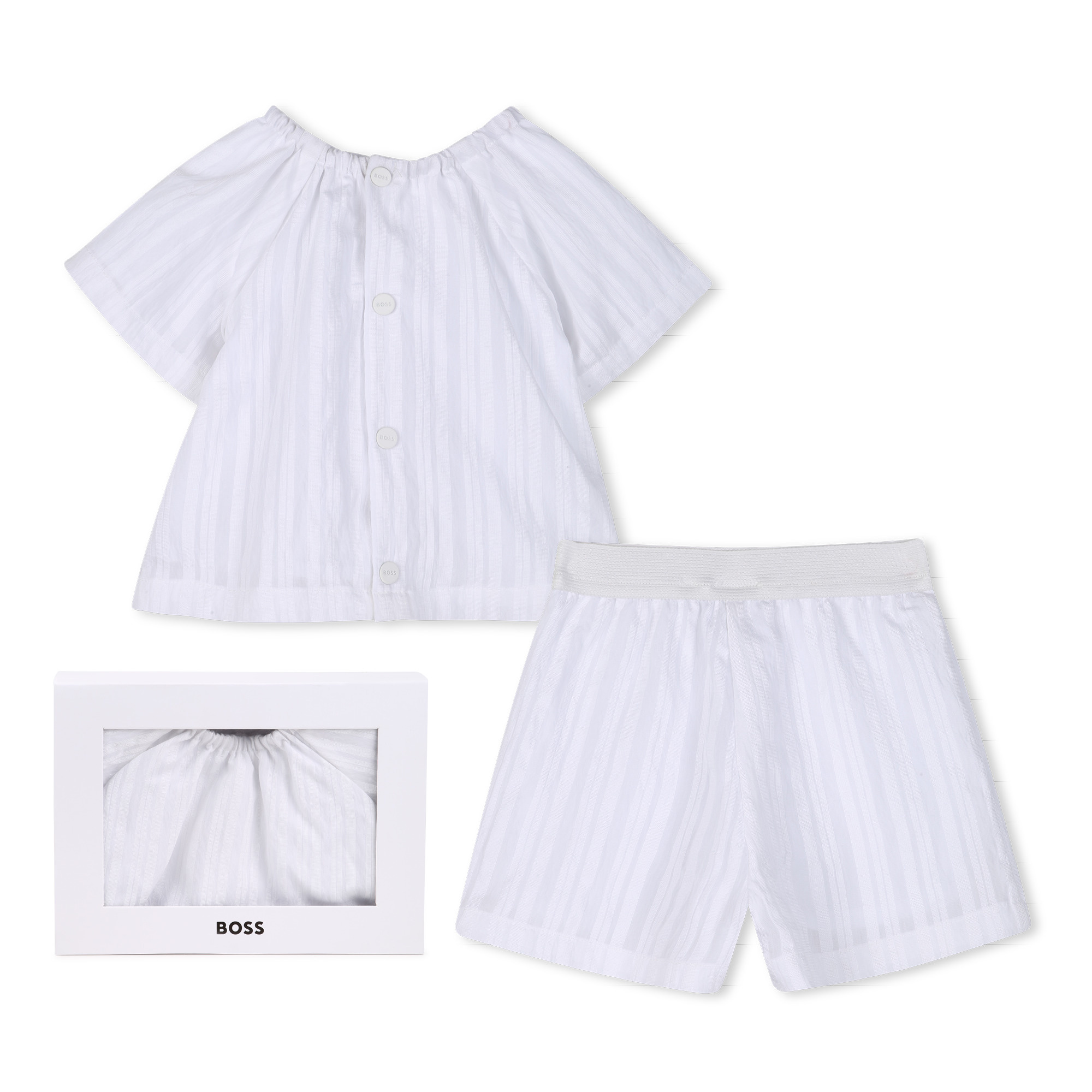 • Two-piece white striped set with a top featuring an elasticated collar and snap buttons. Boxer-style shorts with an elasticated waistband.