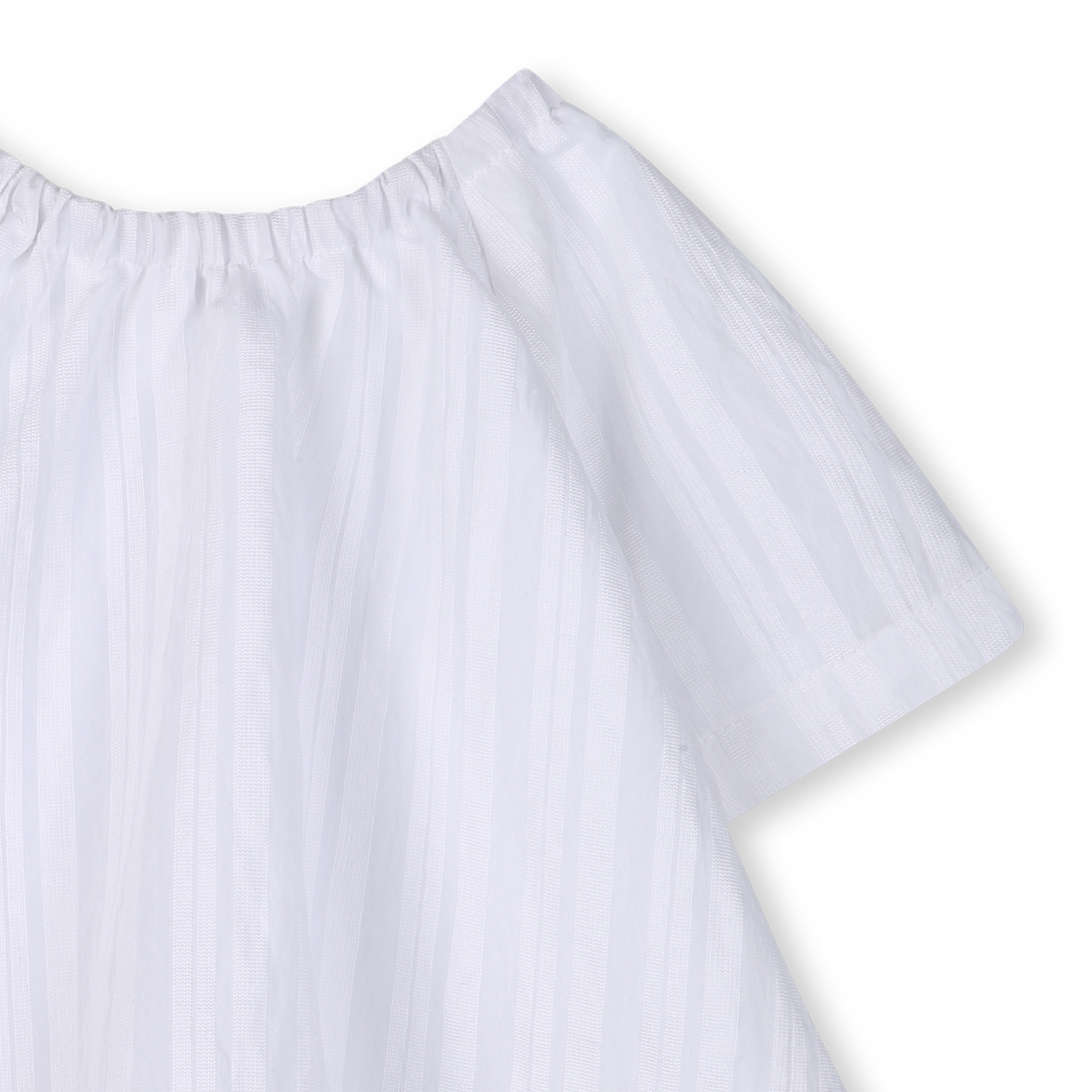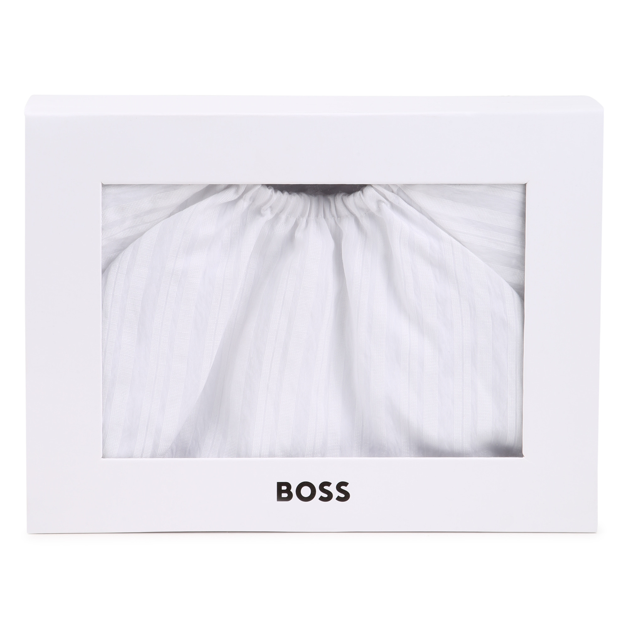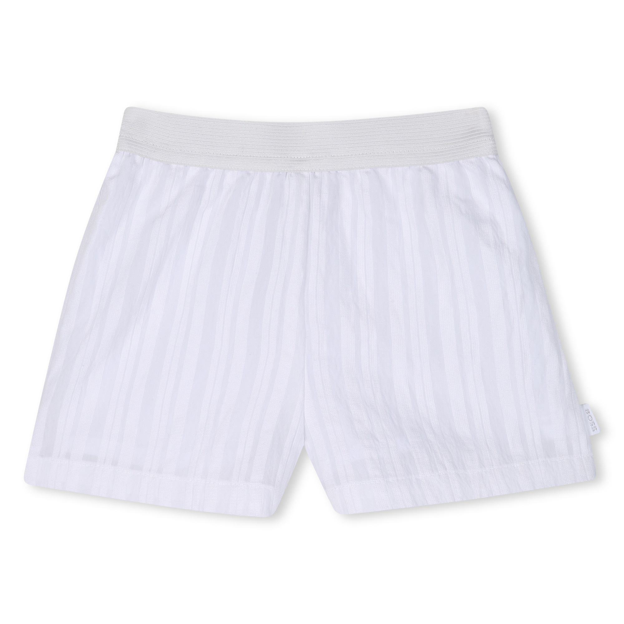 • Two-piece white striped set with a top featuring an elasticated collar and snap buttons. Boxer-style shorts with an elasticated waistband.