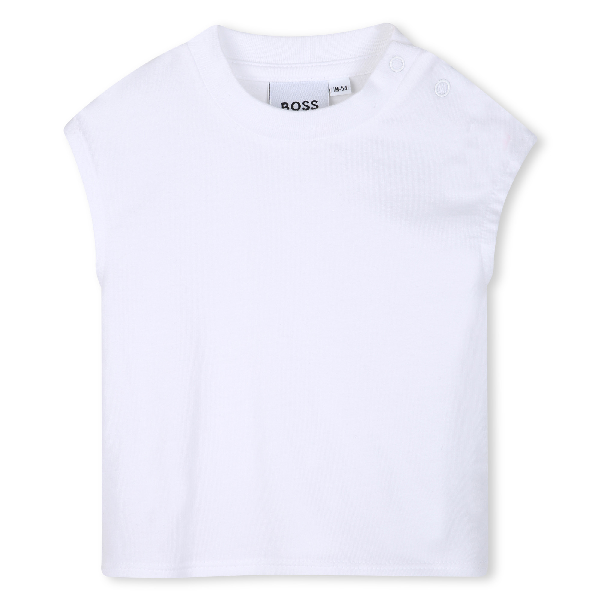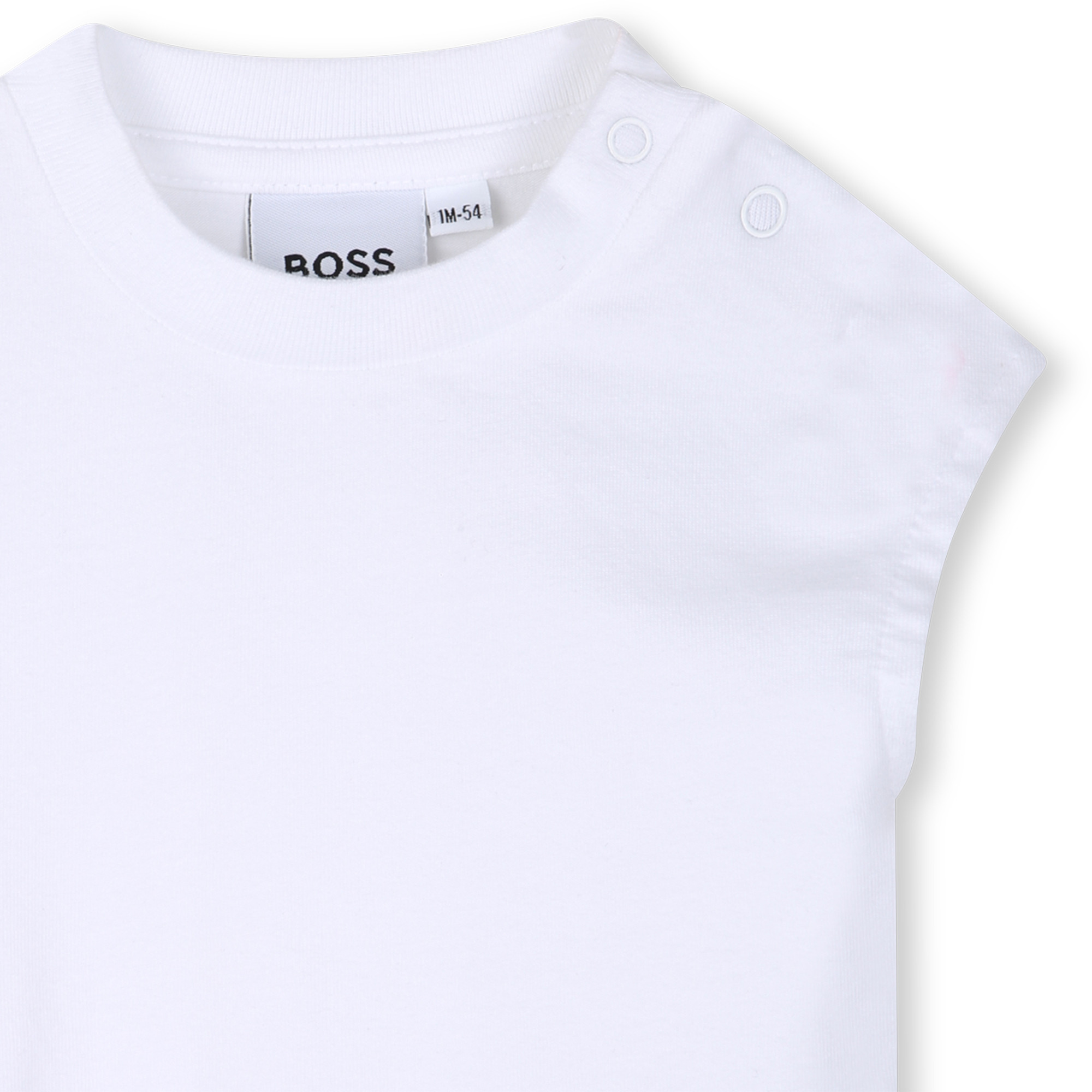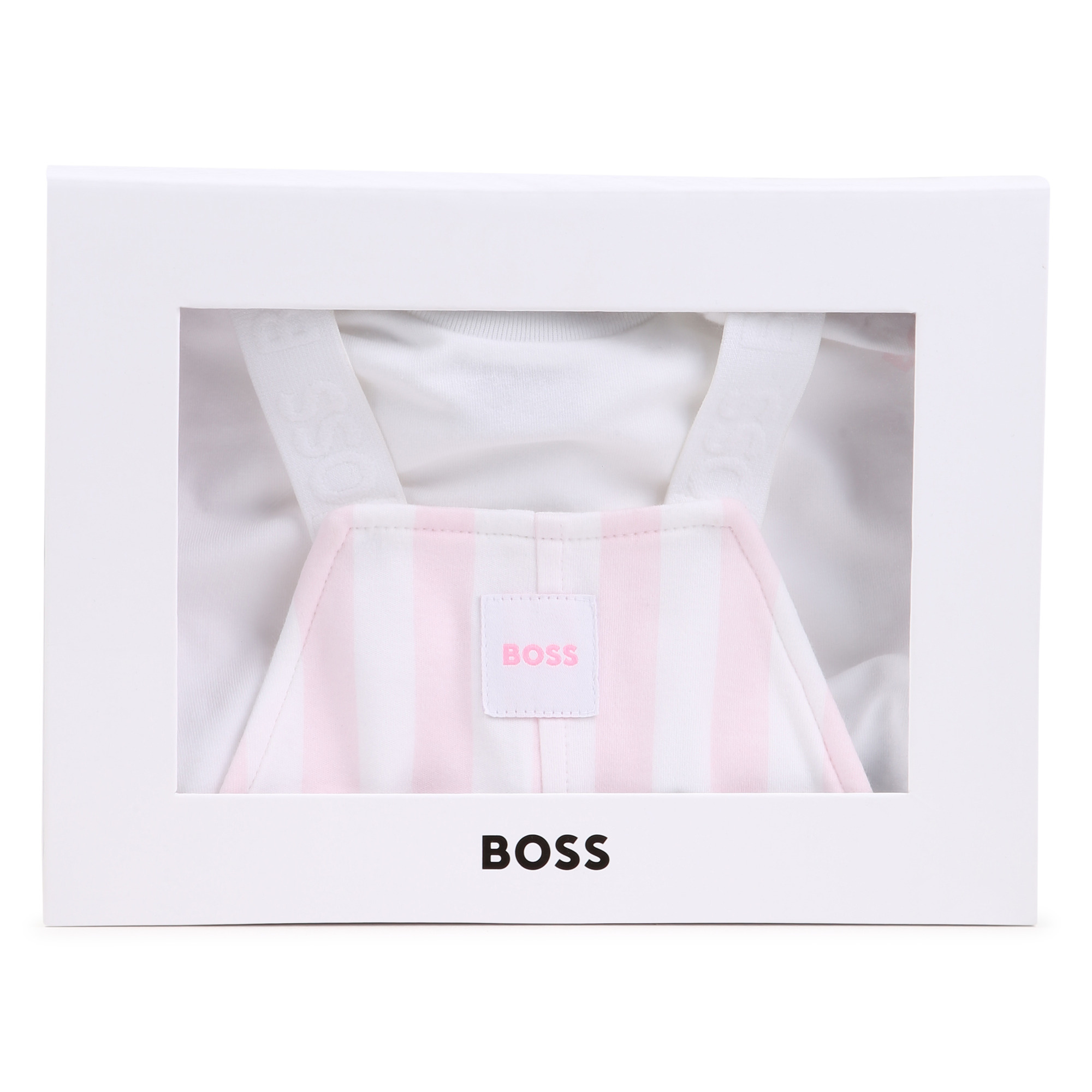 • 2-piece set: White short-sleeved T-shirt and white and pink striped overalls with snap-button straps.