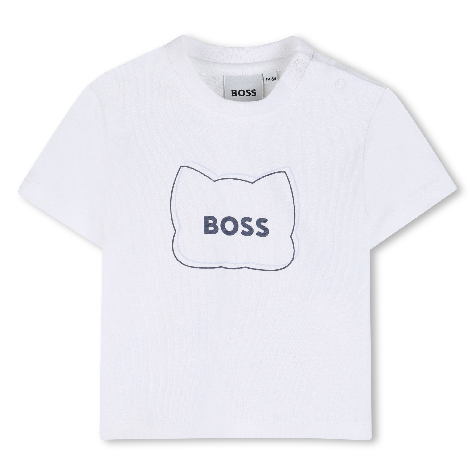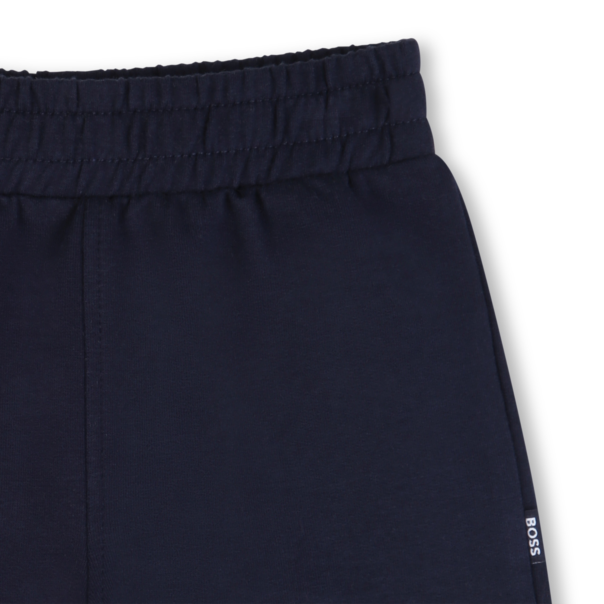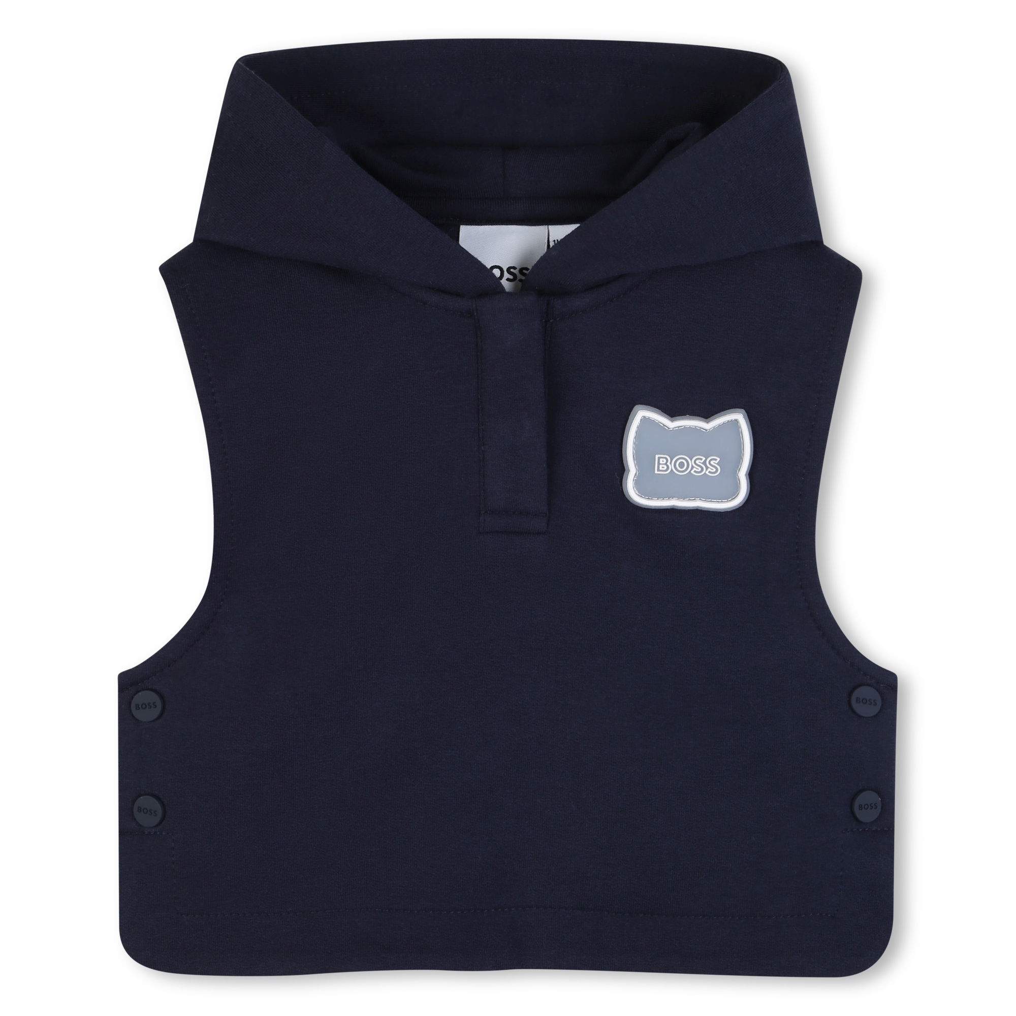 • 3-piece set: White T-shirt with navy print, navy shorts with elasticated waist, and navy sleeveless jacket with hood and snap buttons.