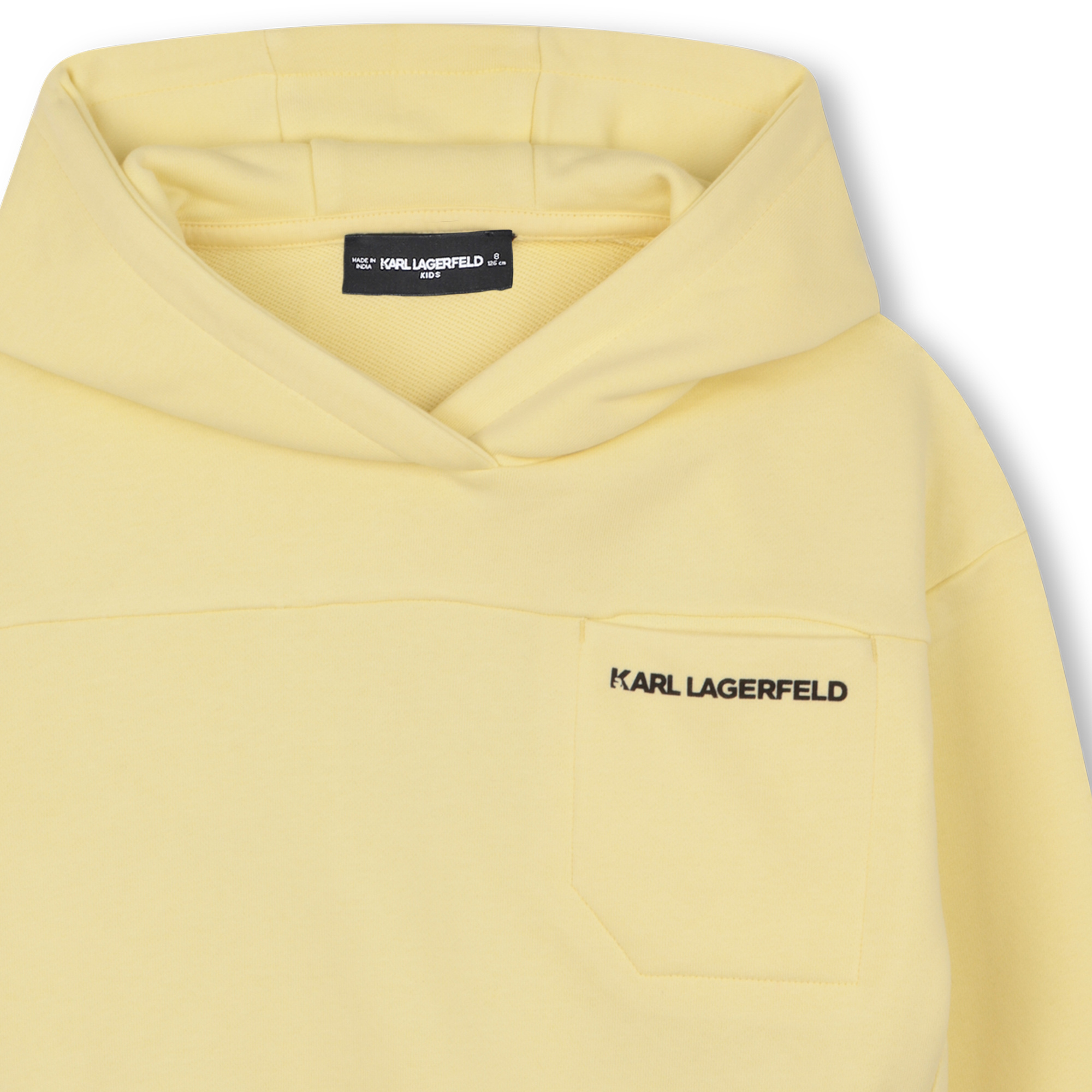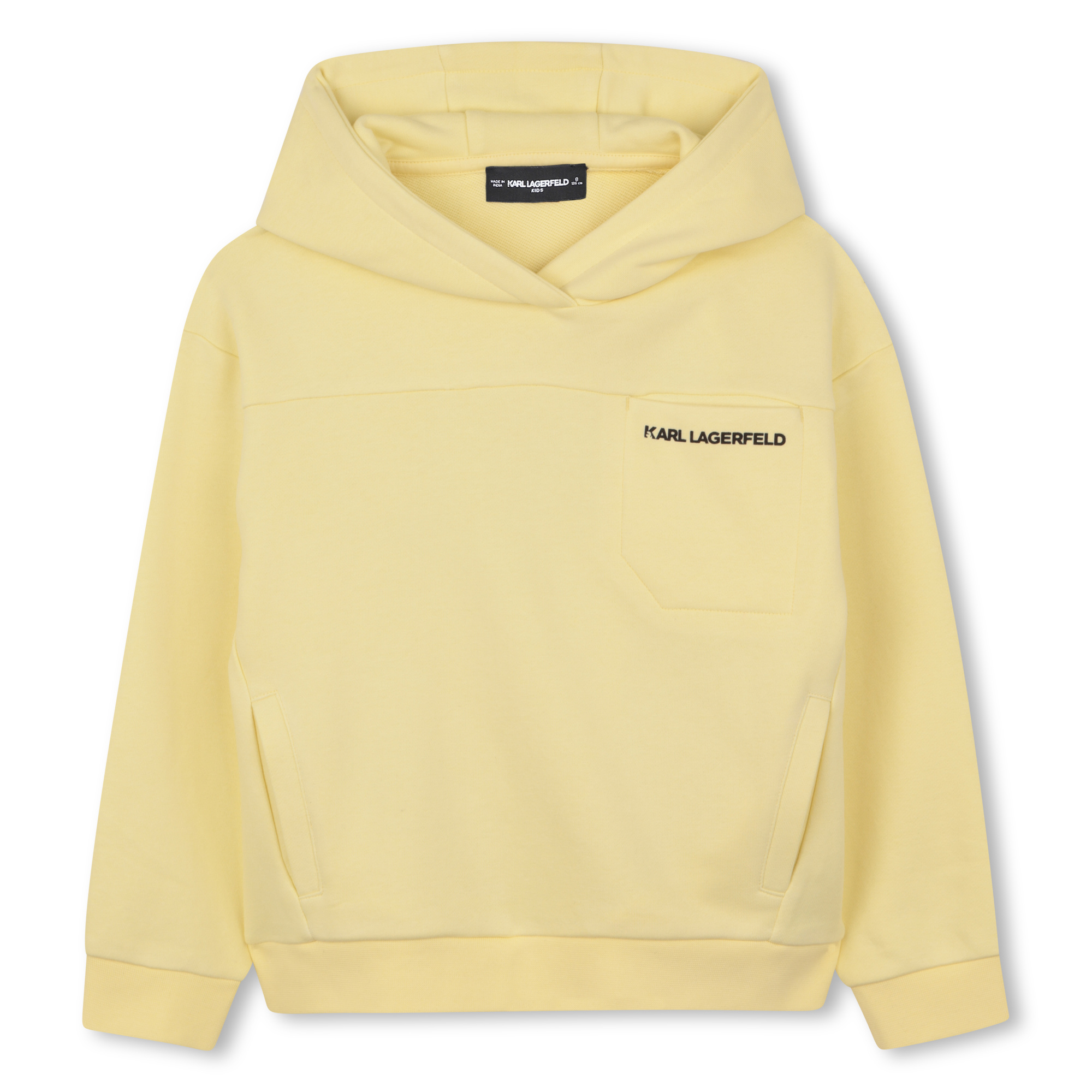 • Yellow hoodie with hood and small front pockets. Black Karl Lagerfeld print on the back.