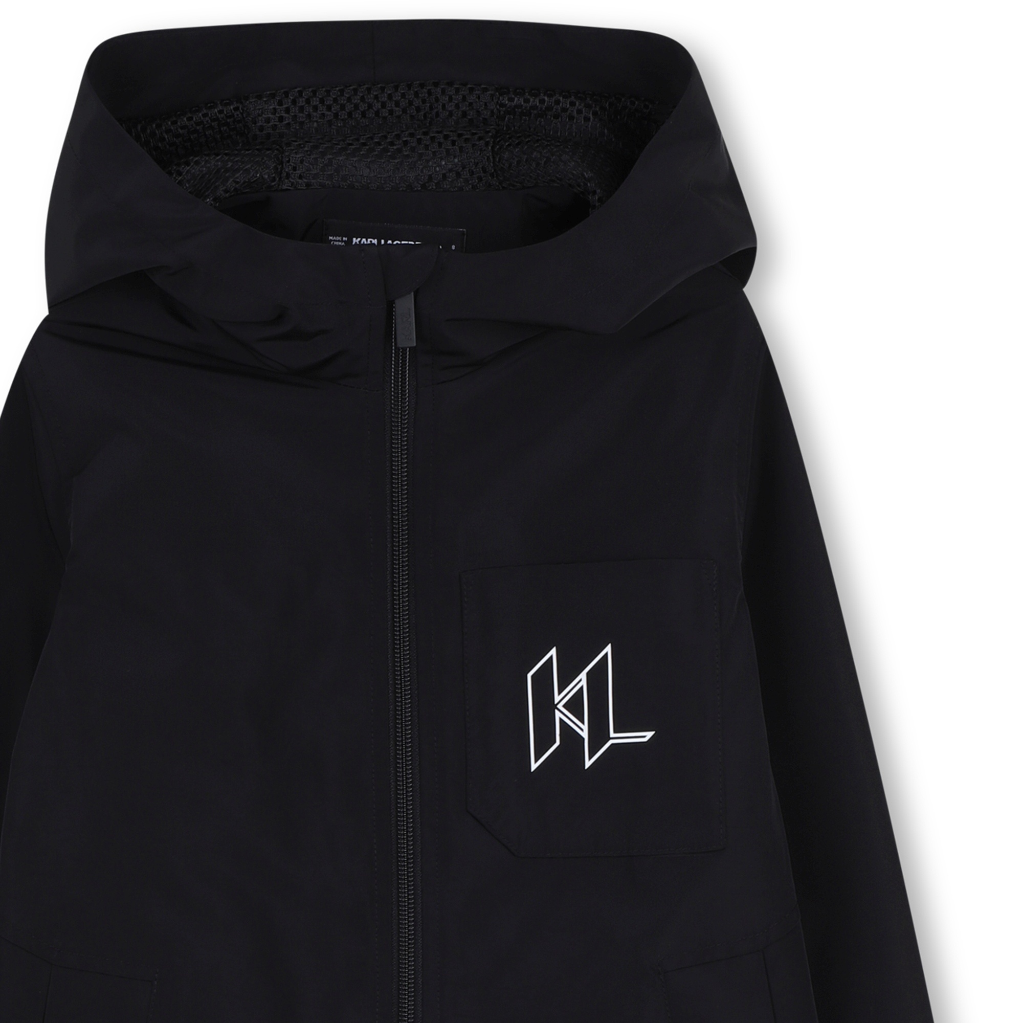 • Black jacket with hood and zip closure. Two front pockets and embossed white lettering on the right sleeve.