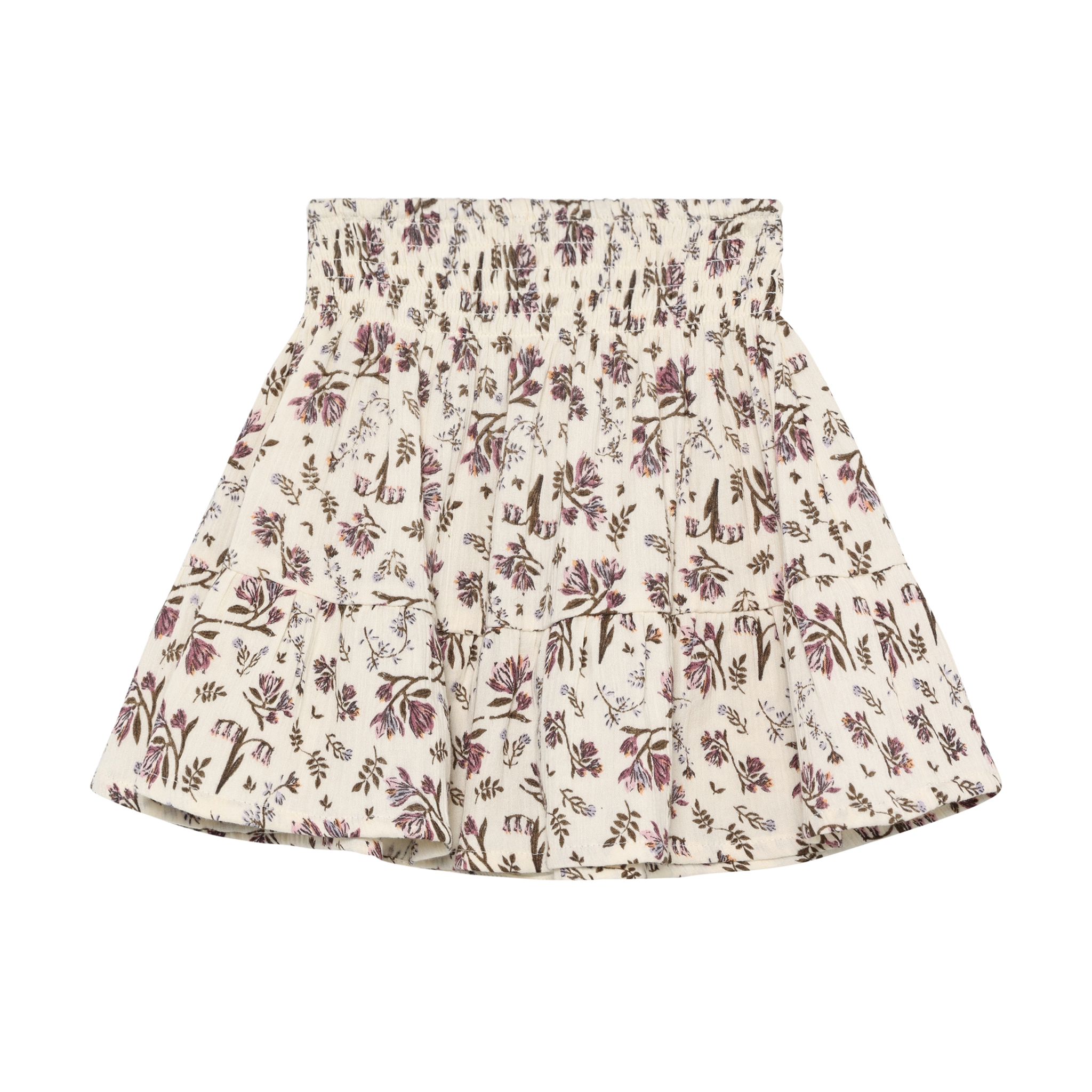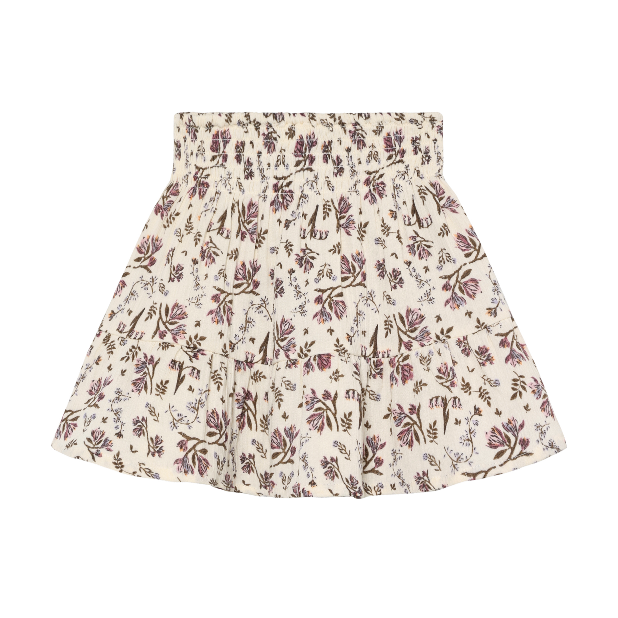 • Off-white elasticated skirt with brown and mauve floral print.
