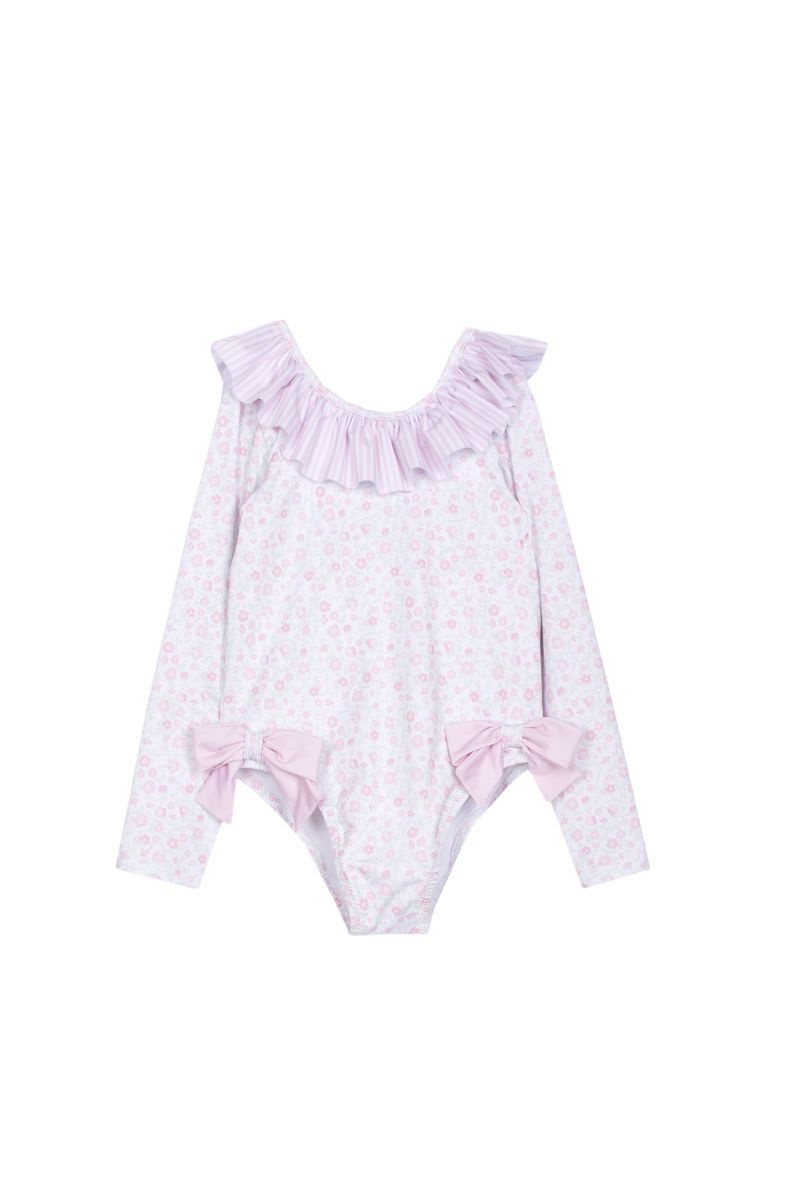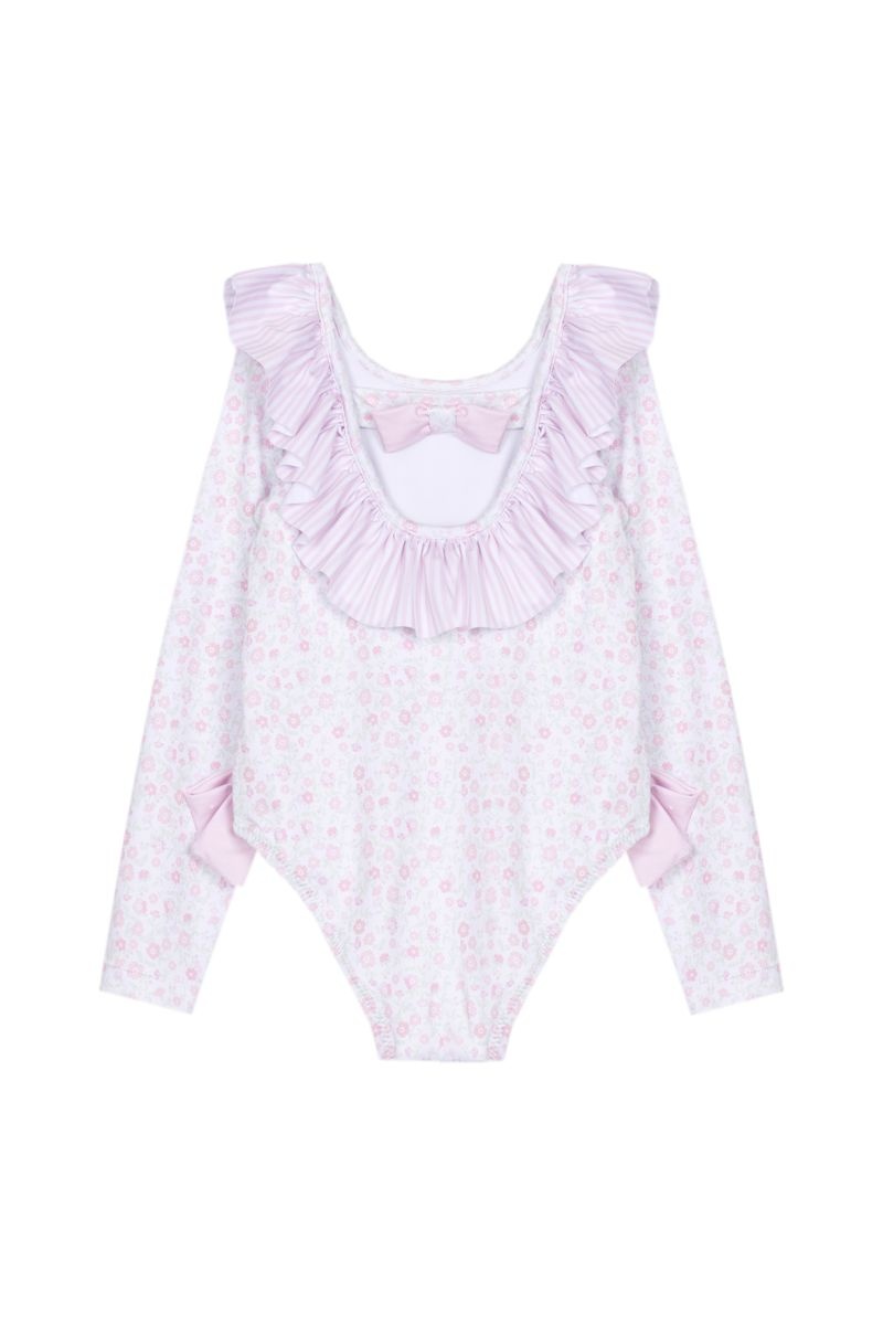 • Pink long-sleeved swimsuit with floral print.