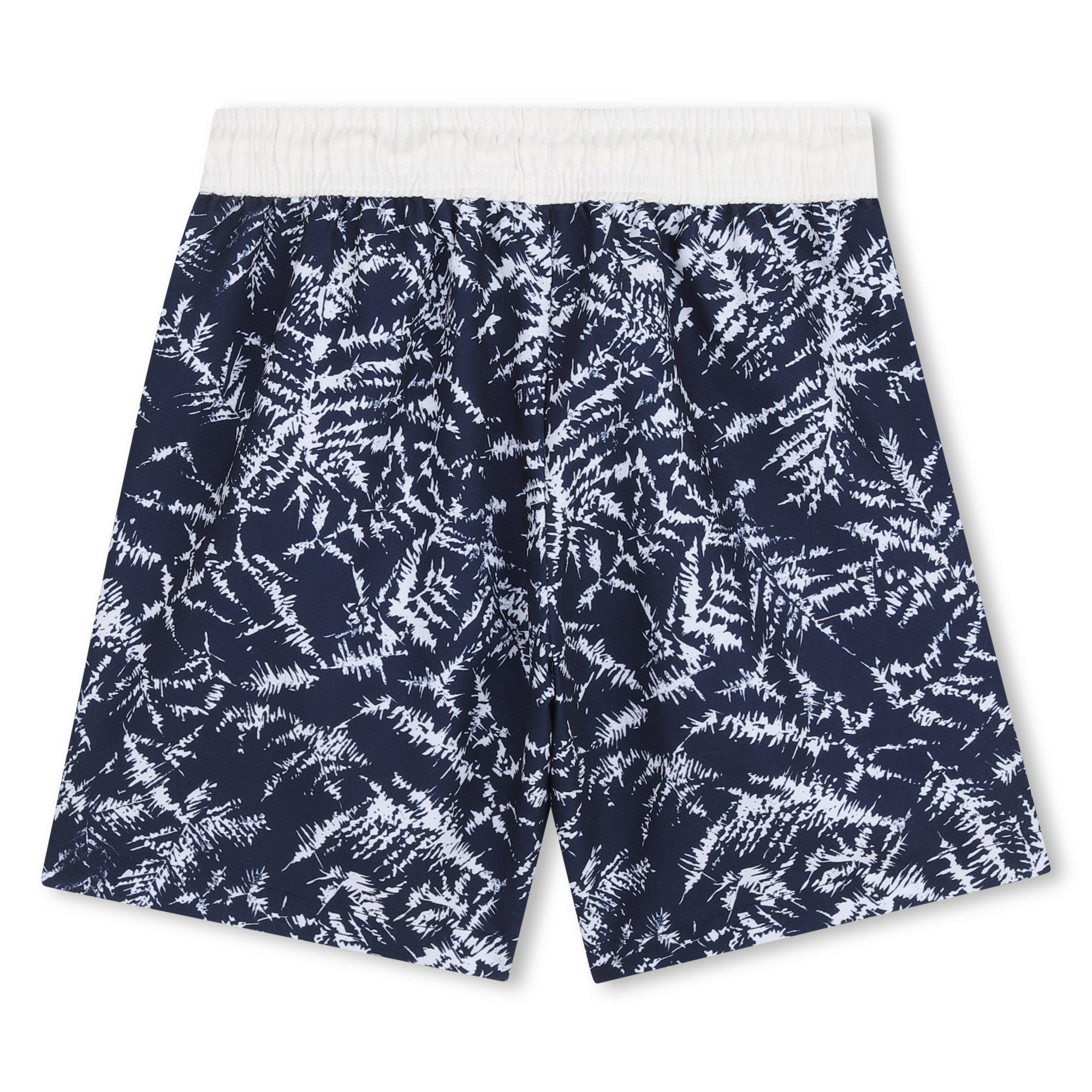 • Navy and white swimsuit with a botanical print.