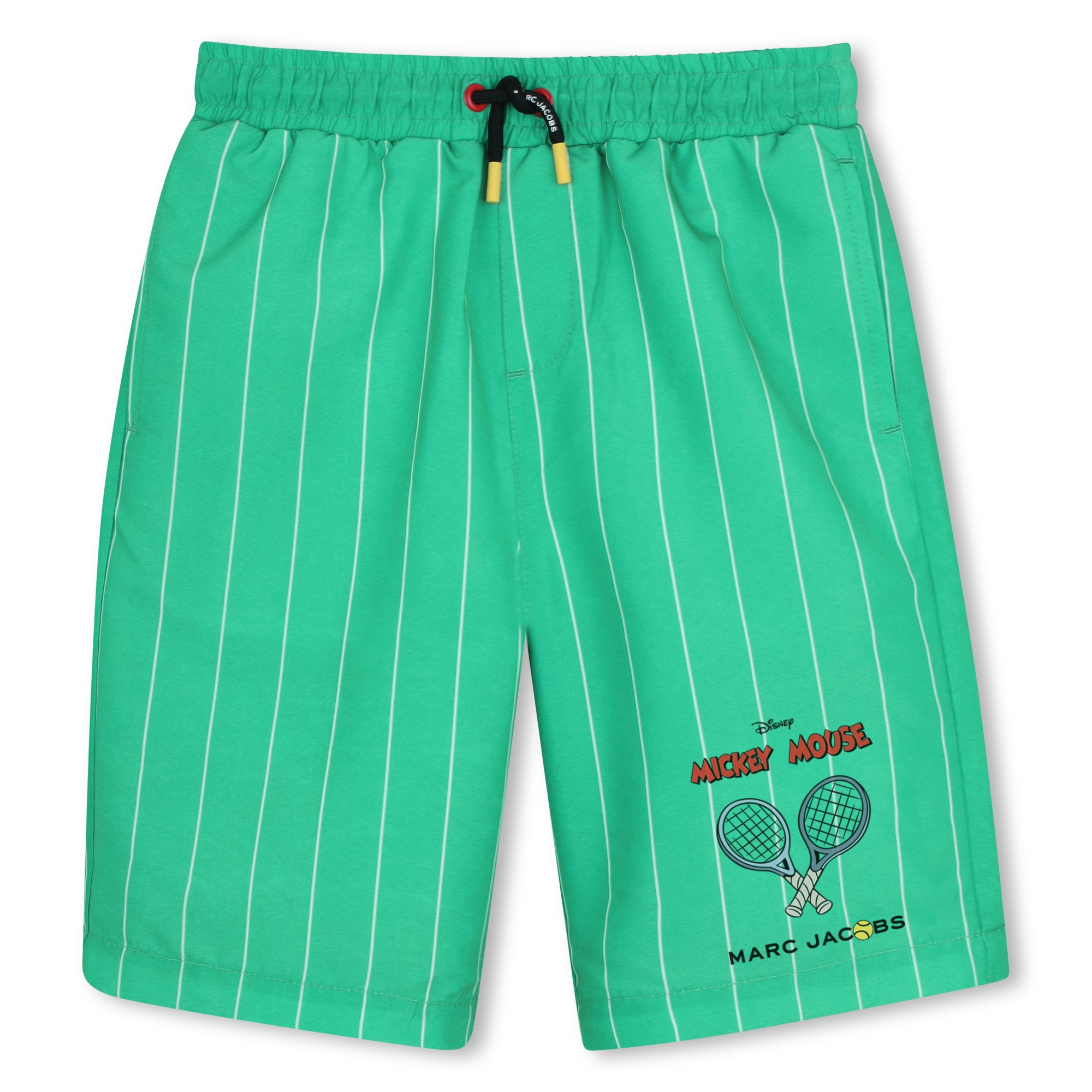 • Green and white striped swimsuit with Mickey Mouse tennis print.