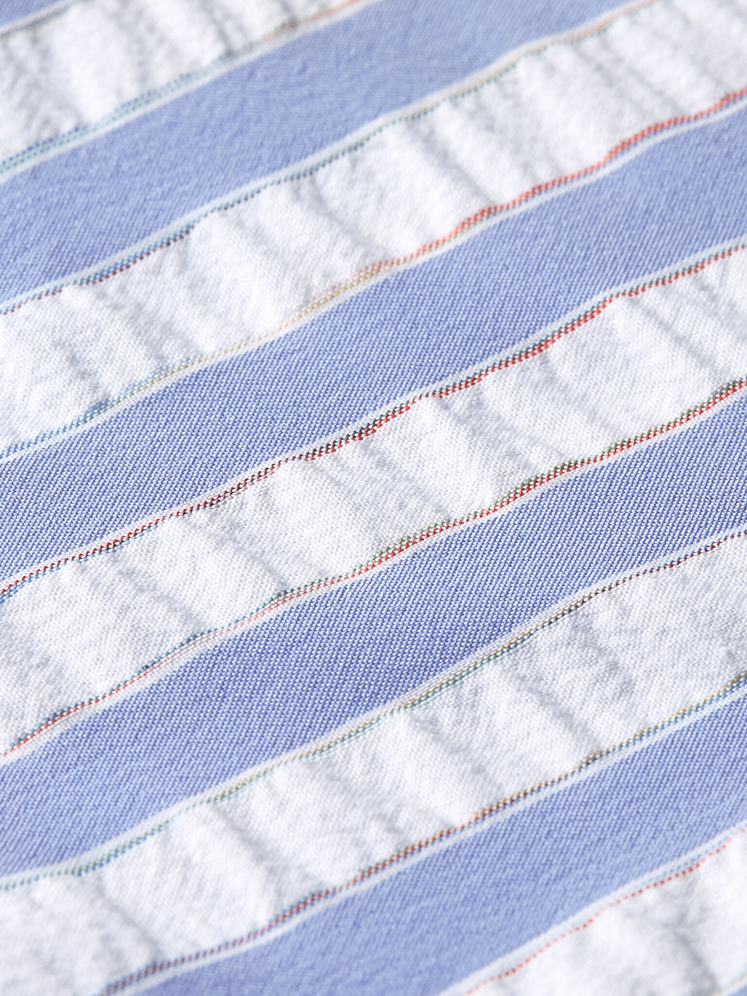 • Blue and white striped swimsuit with white drawstring.