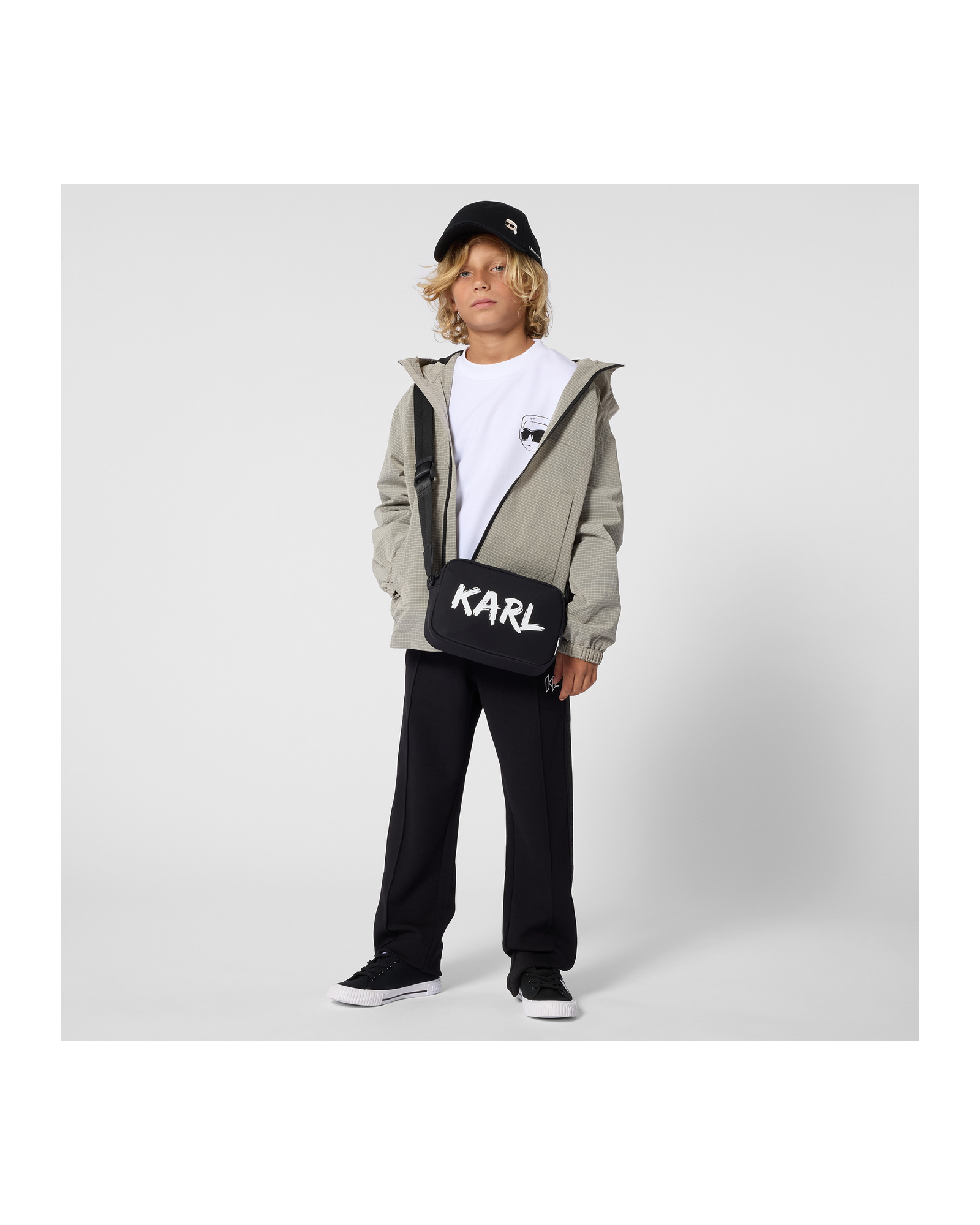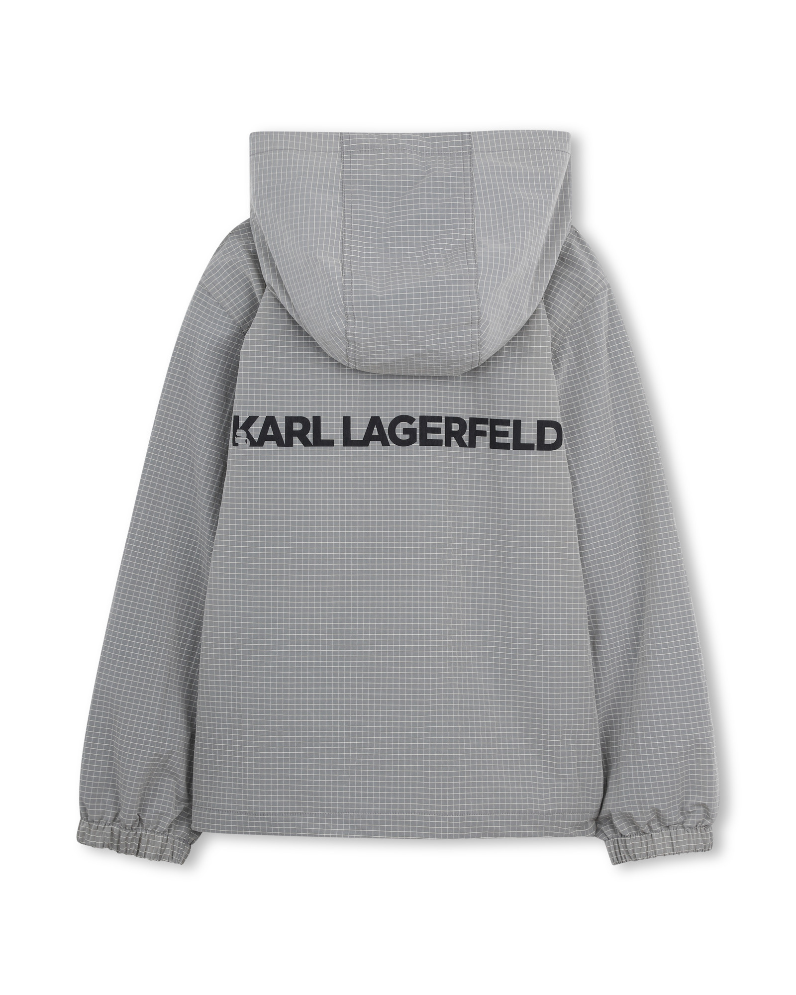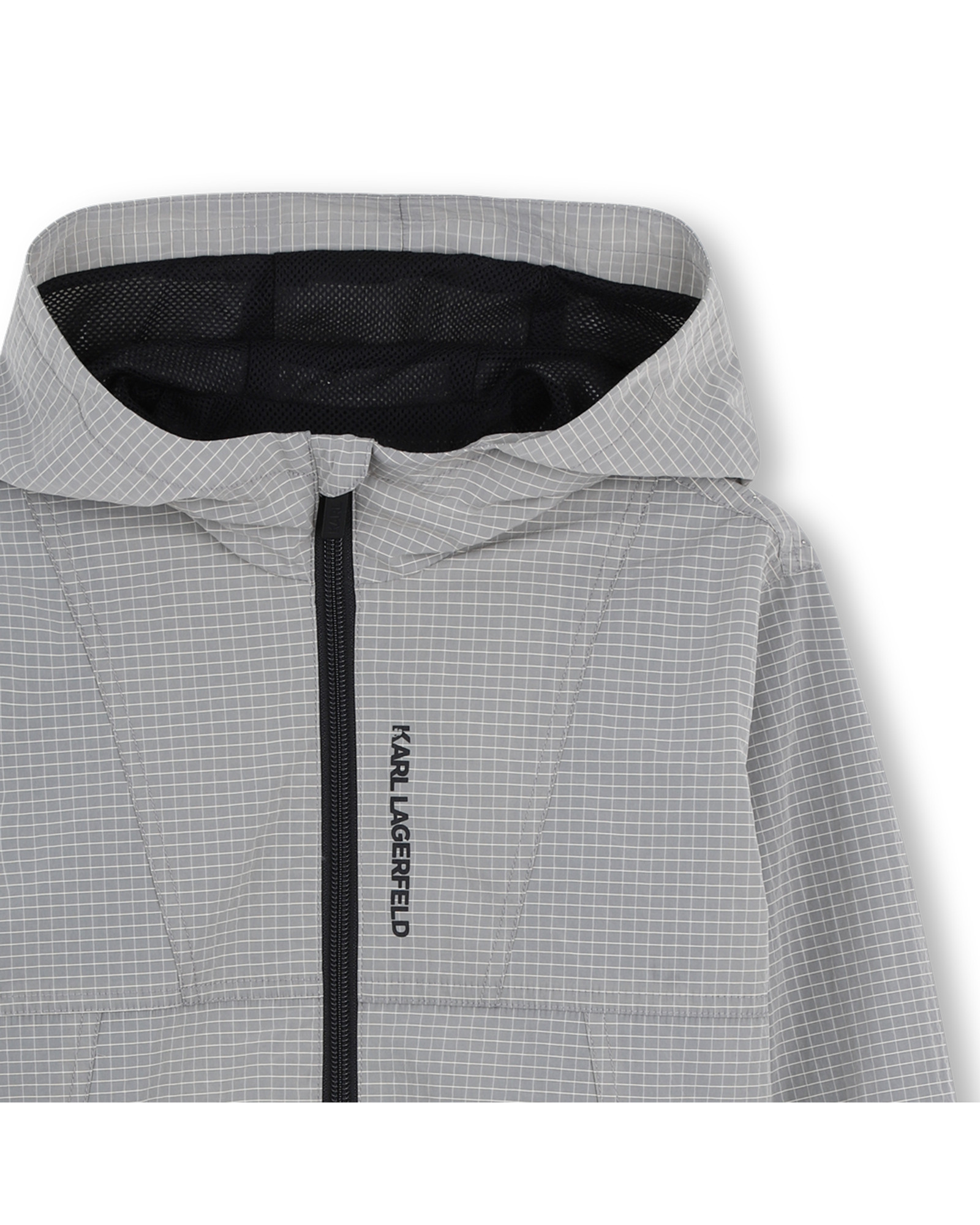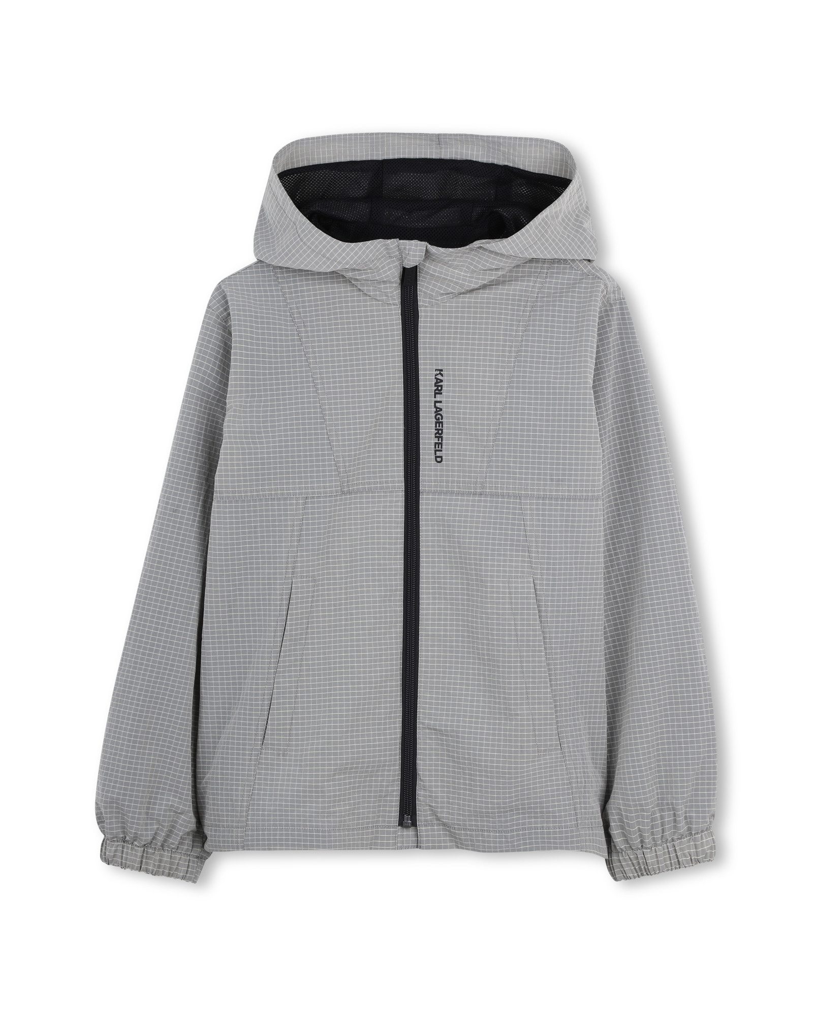 • Grey plaid hooded coat with black zipper and lettering on the back.