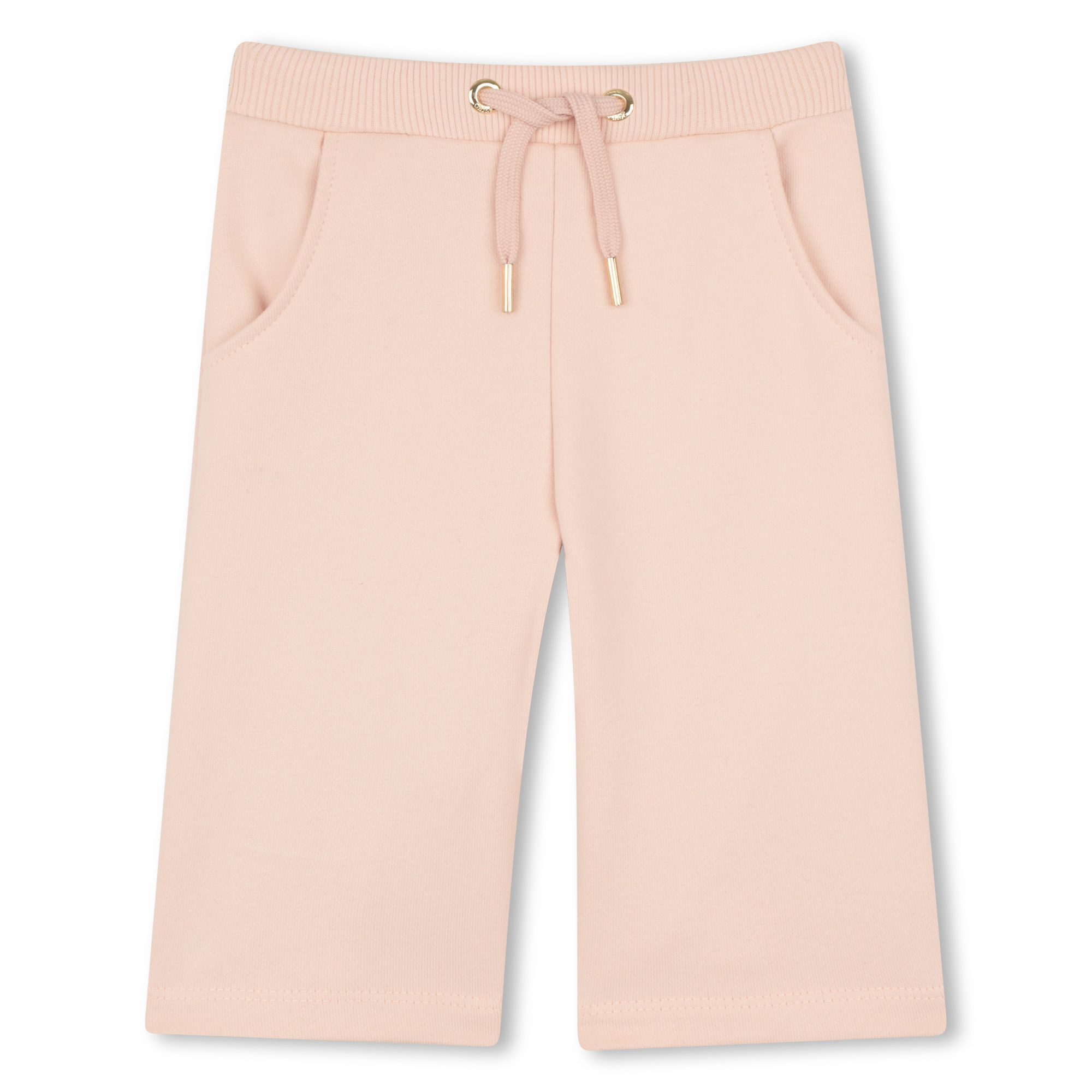 • Pink jogging pants with elasticated waistband, drawstrings, and pockets.