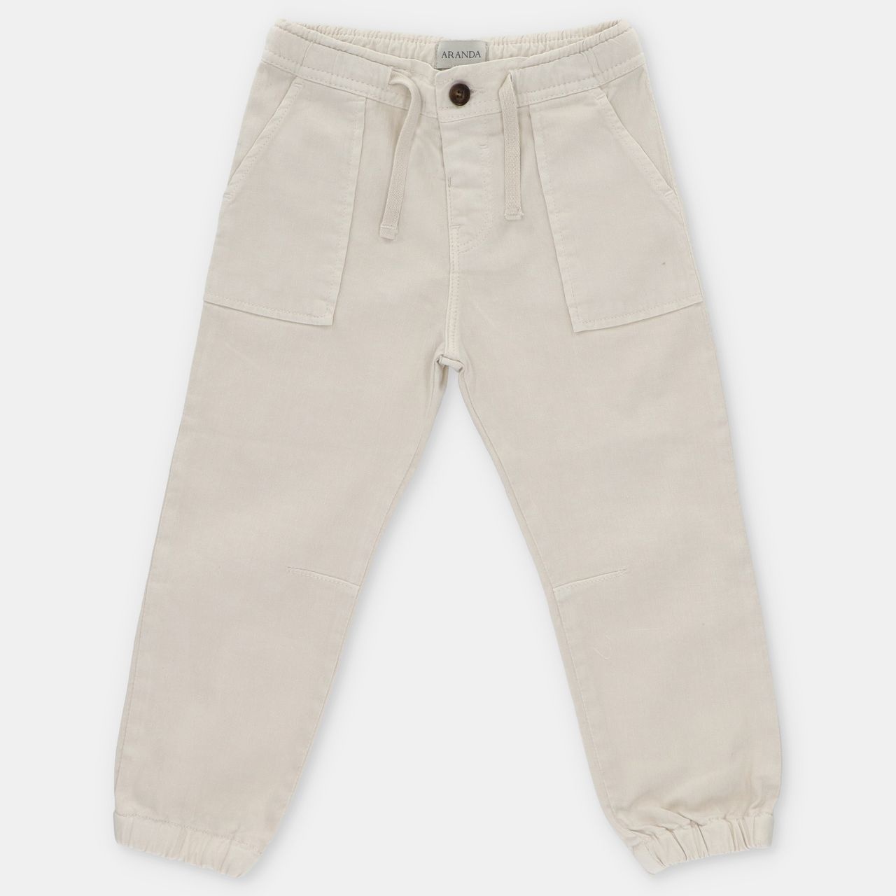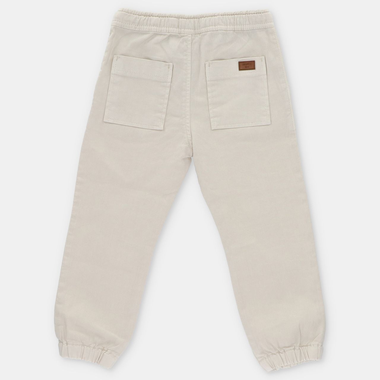 • Beige pants with elastic waistband.