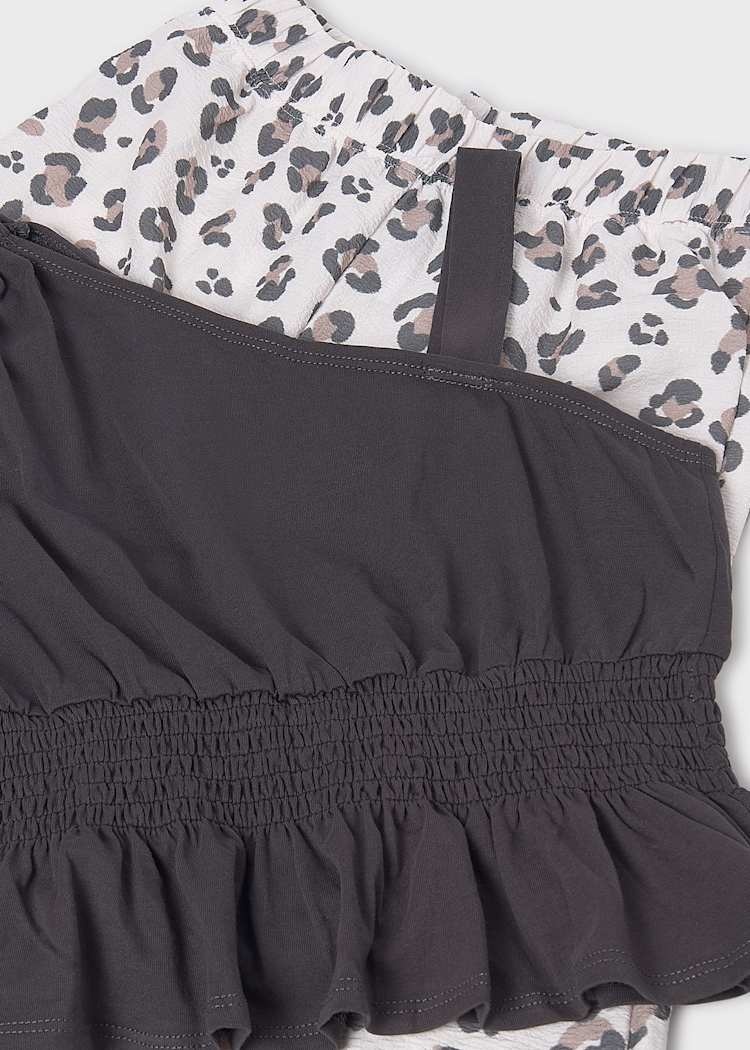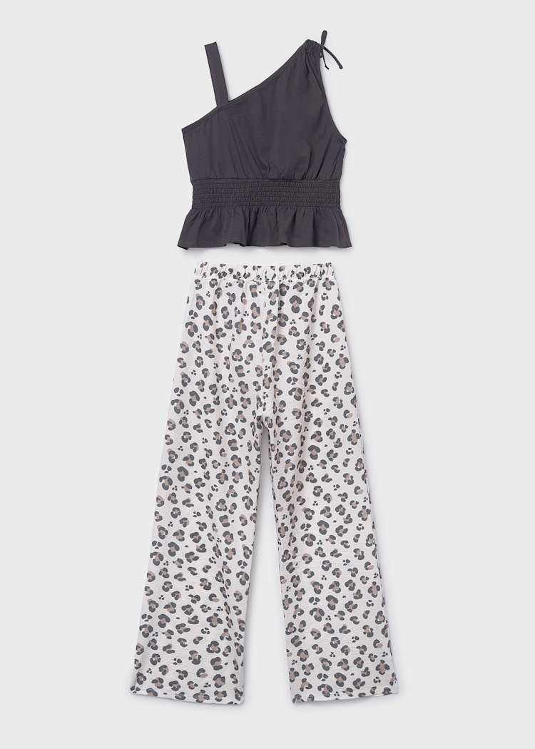 • Two-piece set including a gray top and leopard print pants with an elastic waistband.