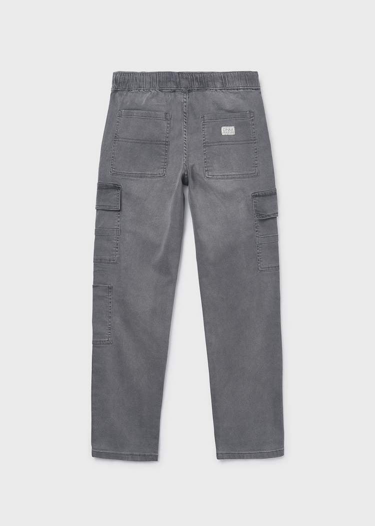 • Gray cargo pants with adjustable waist.