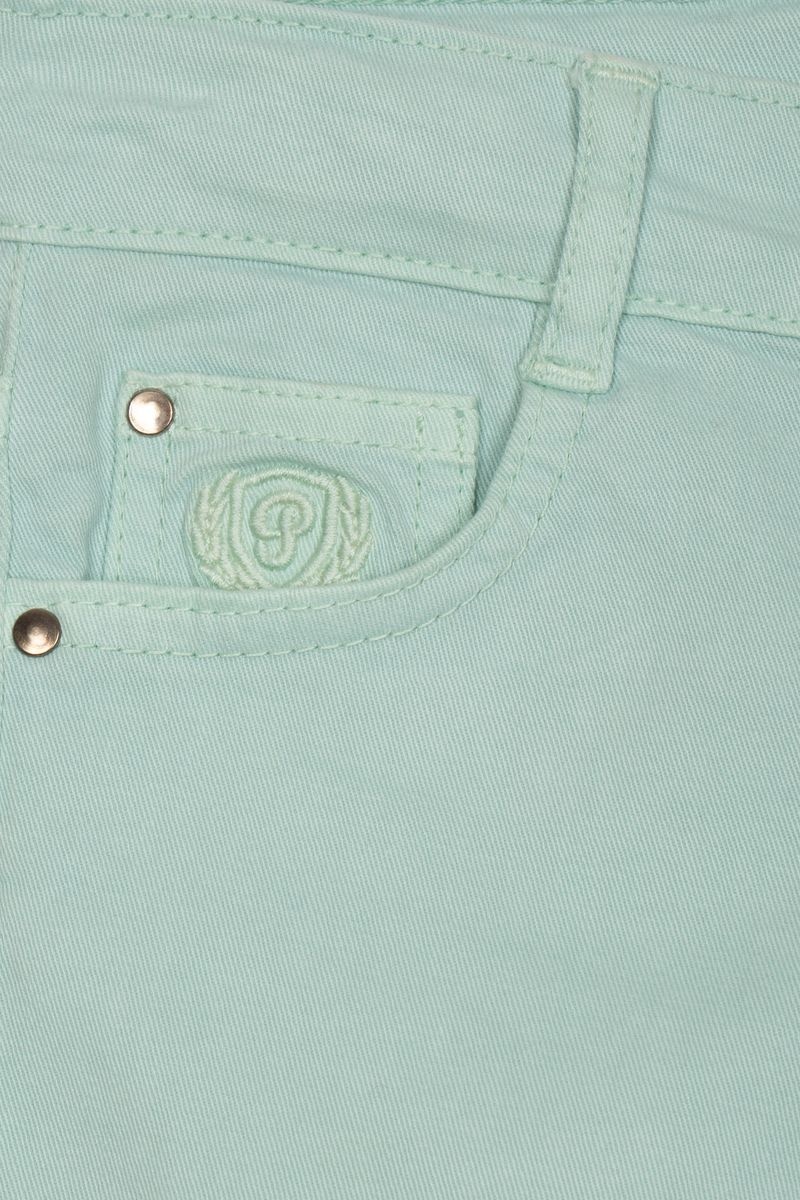 • Green pants with an adjustable waist, button and zip fastening.
