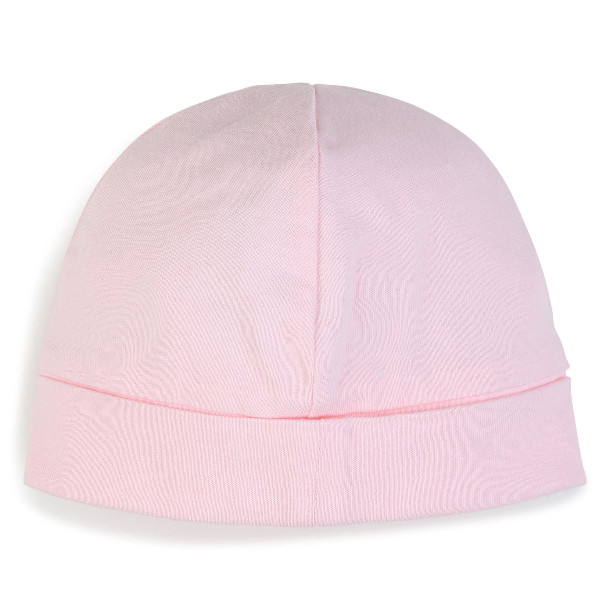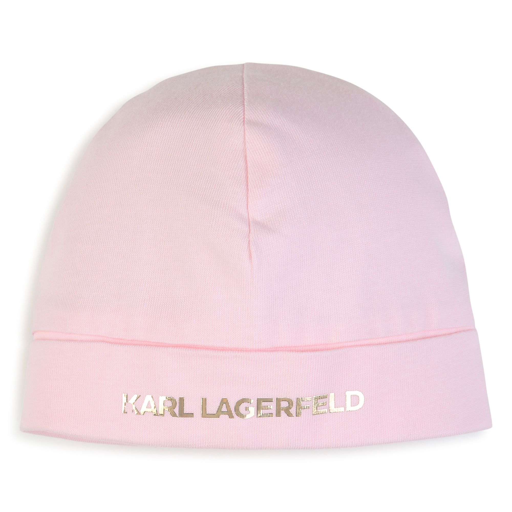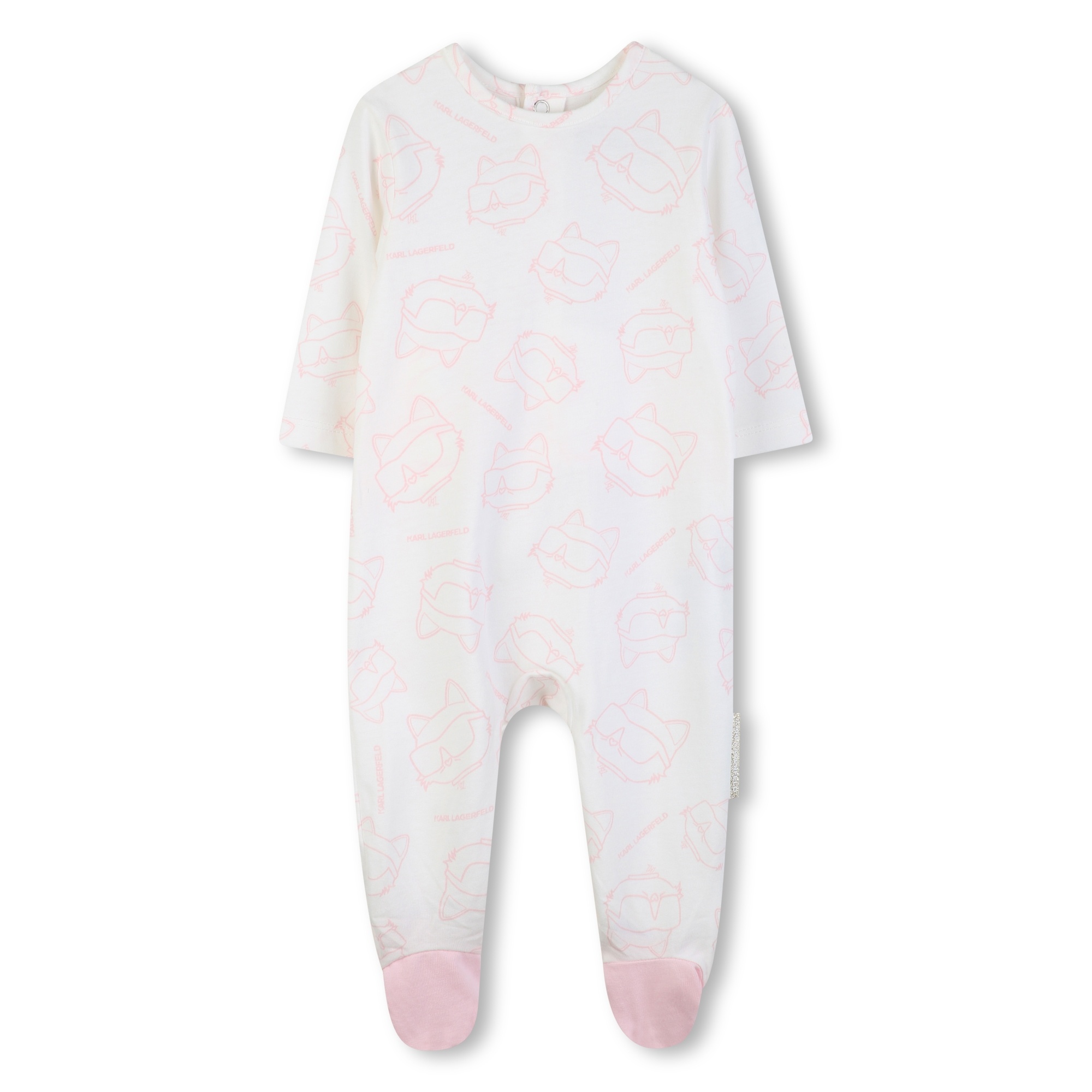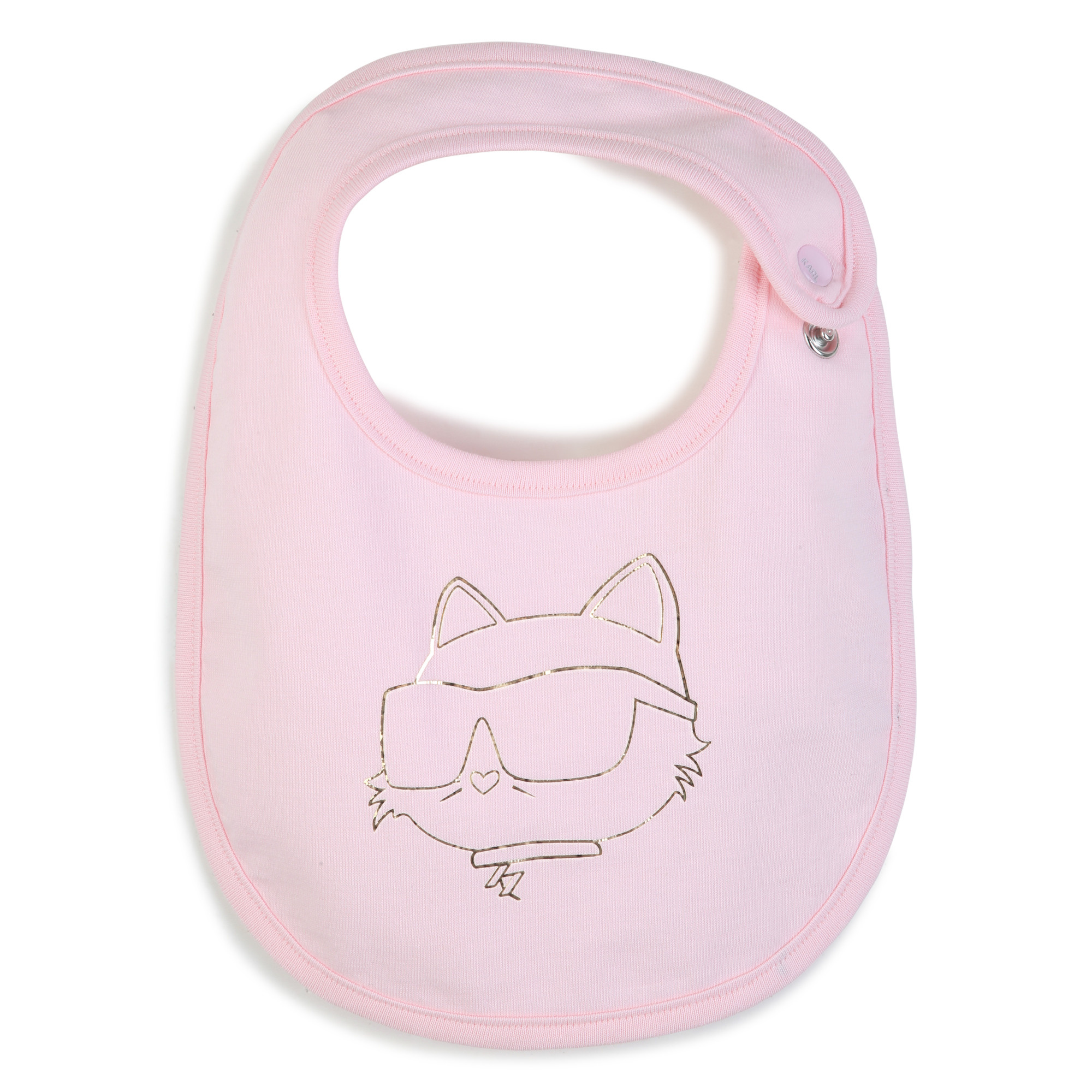 3-piece set: White T-shirt with kitten logo, pink jacket with white sleeves, gold details at the hem and snap buttons, pink pants with gold lettering down the leg.