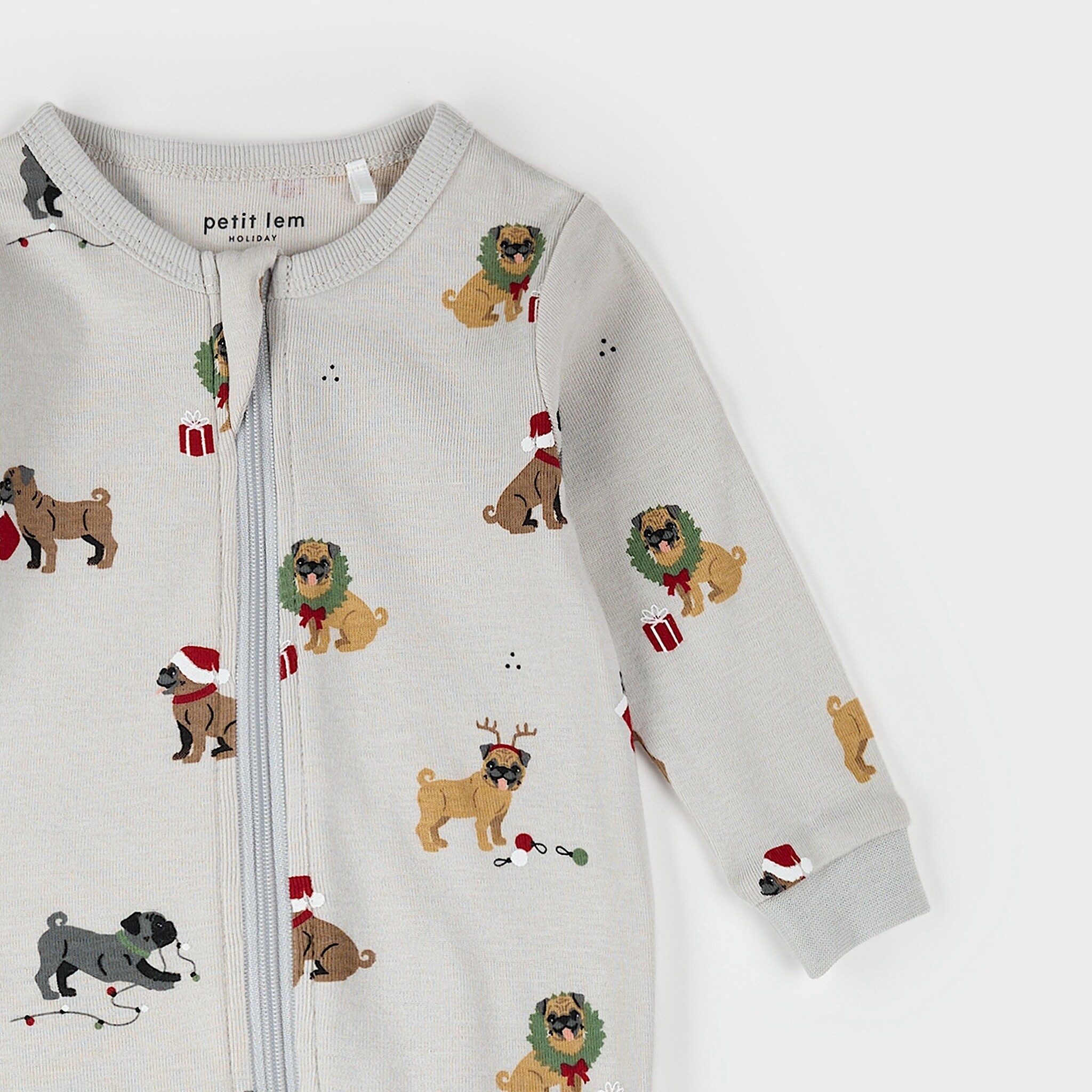 • Light gray printed pyjamas with integrated feet and ribbed cuffs for optimal comfort, as well as a two-way zipper for easy changing.