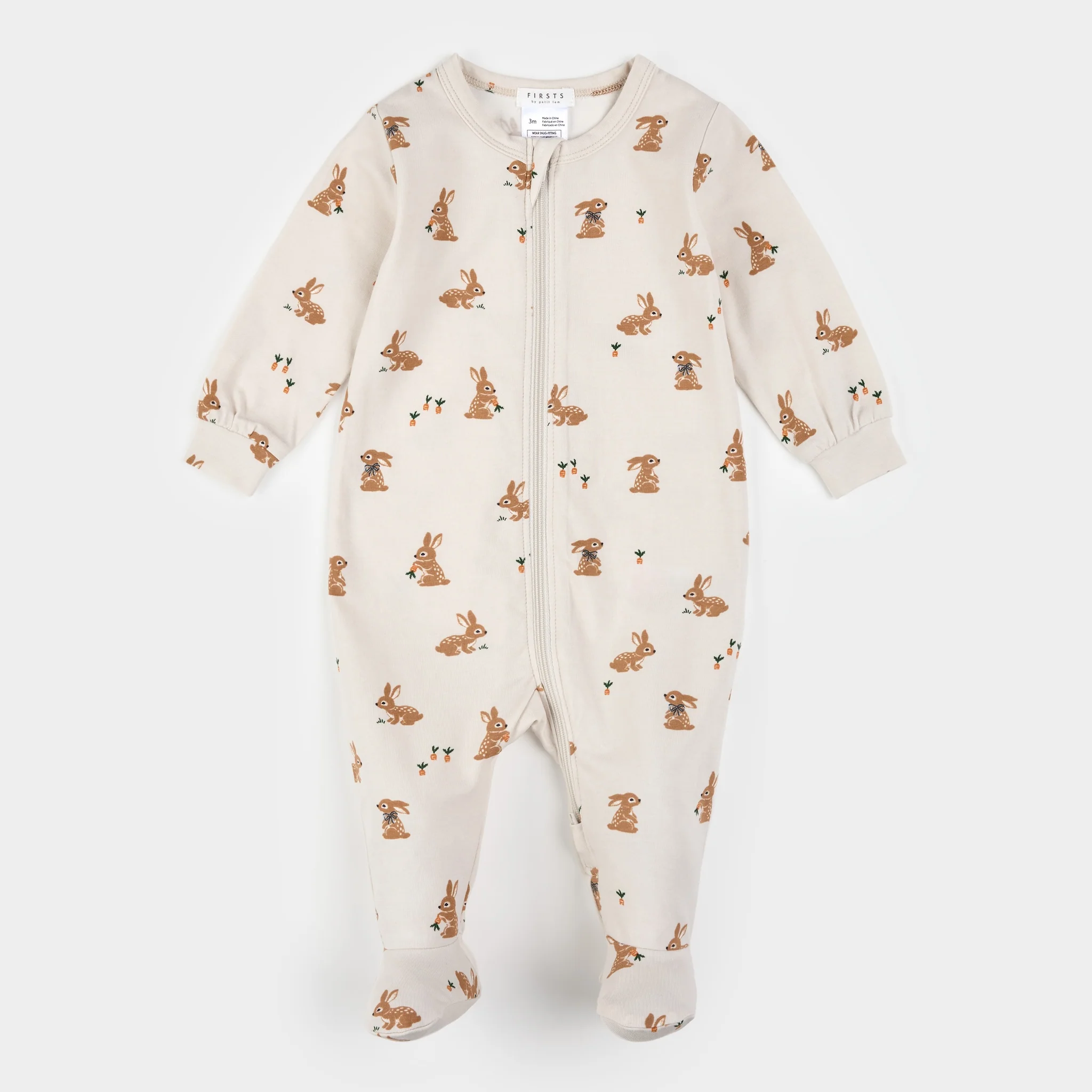 Light gray printed pyjamas with integrated feet and ribbed cuffs for optimal comfort, as well as a two-way zipper for easy changing.