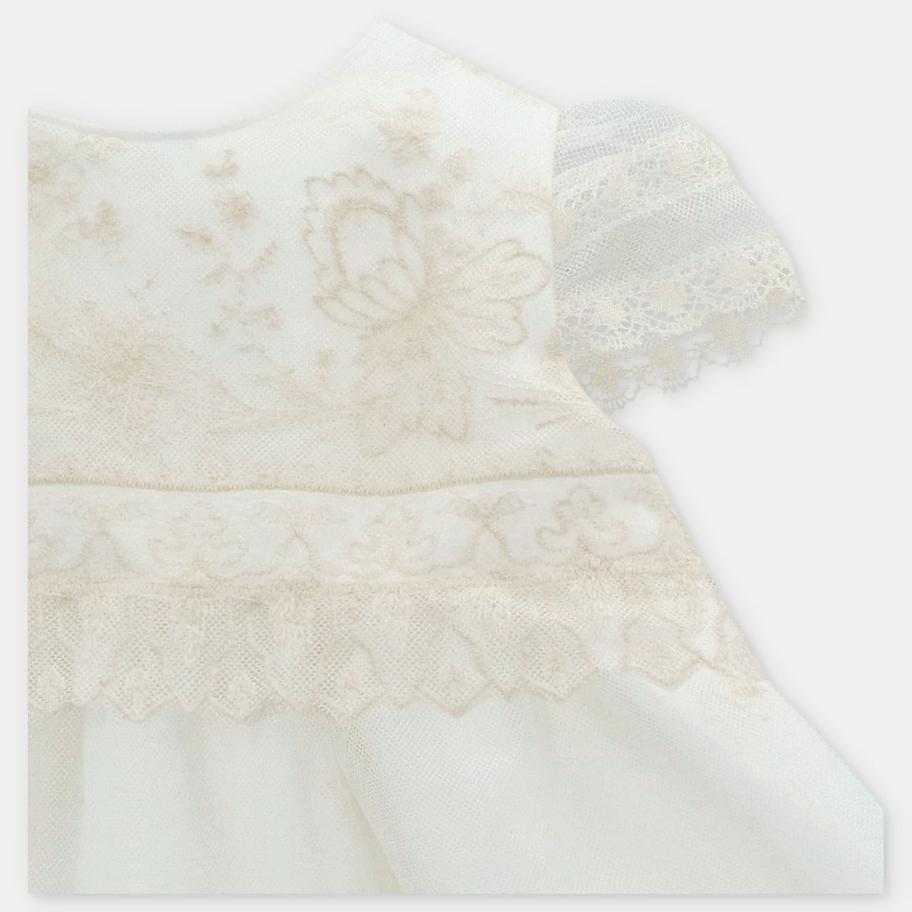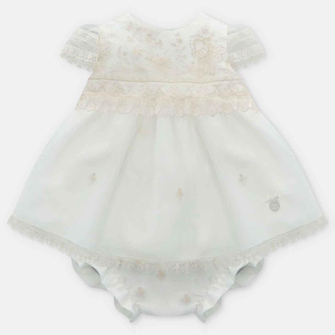 • Off-white dress trimmed with lace, with buttonholes at the back and matching panty.