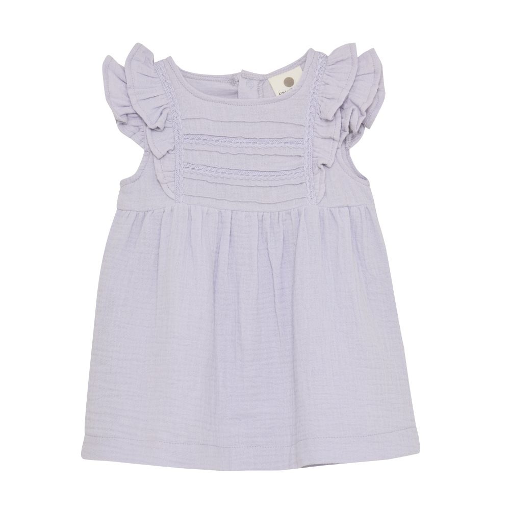 • Lilac short-sleeved dress with small embroidered details on the front and snap buttons at the back.