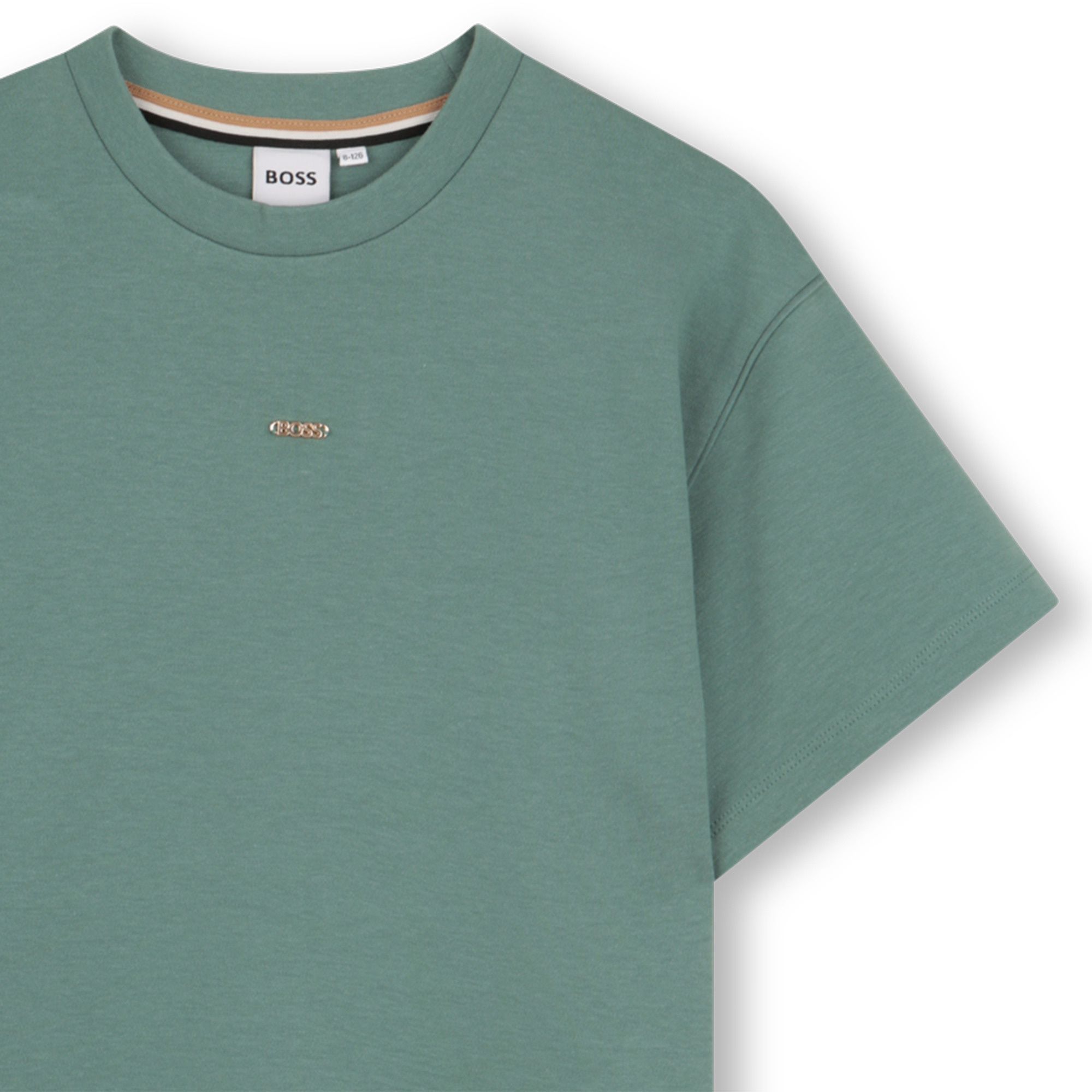 • Green short-sleeved dress with a gold Boss logo on the front.