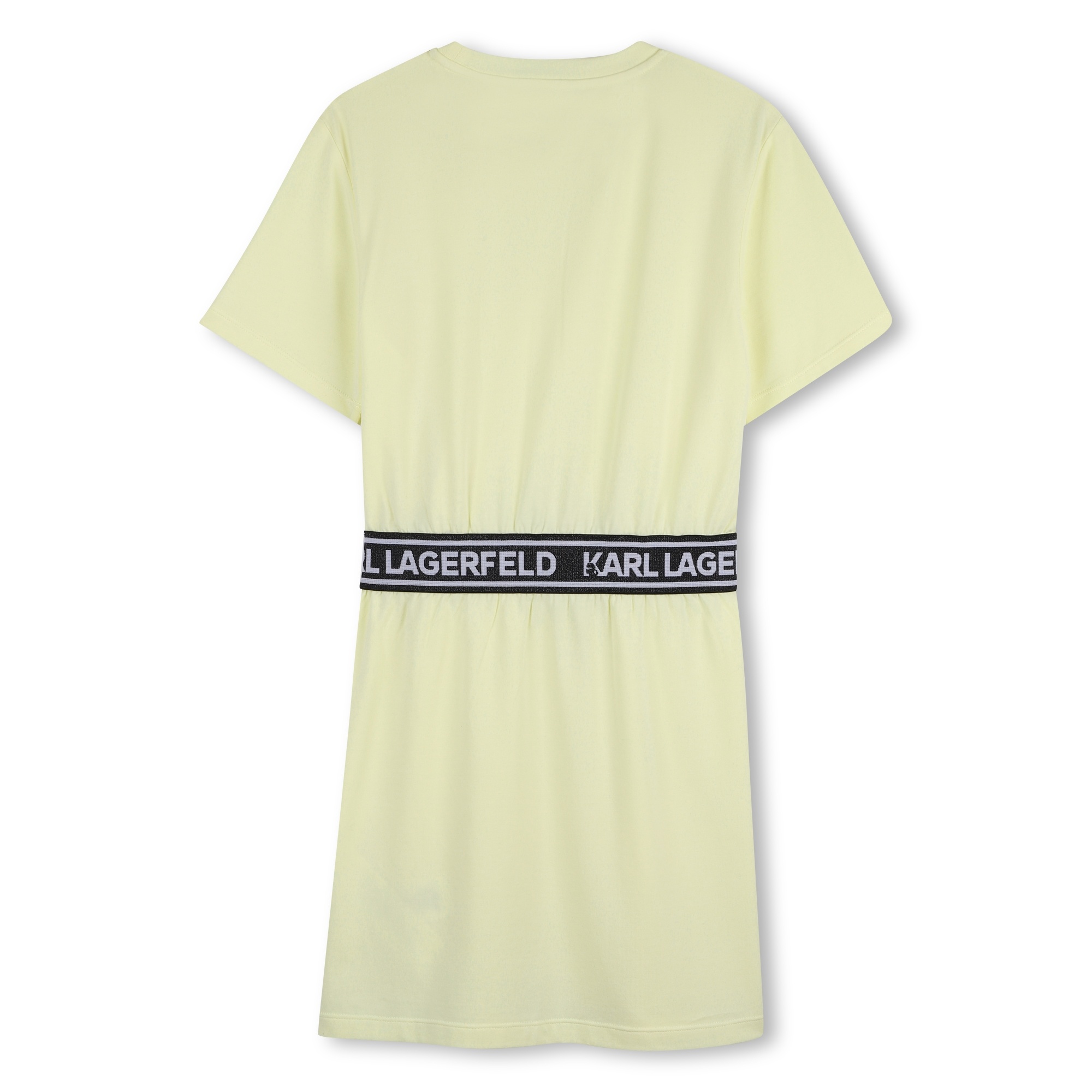• Short-sleeved yellow dress with a black and white elasticated waistband.