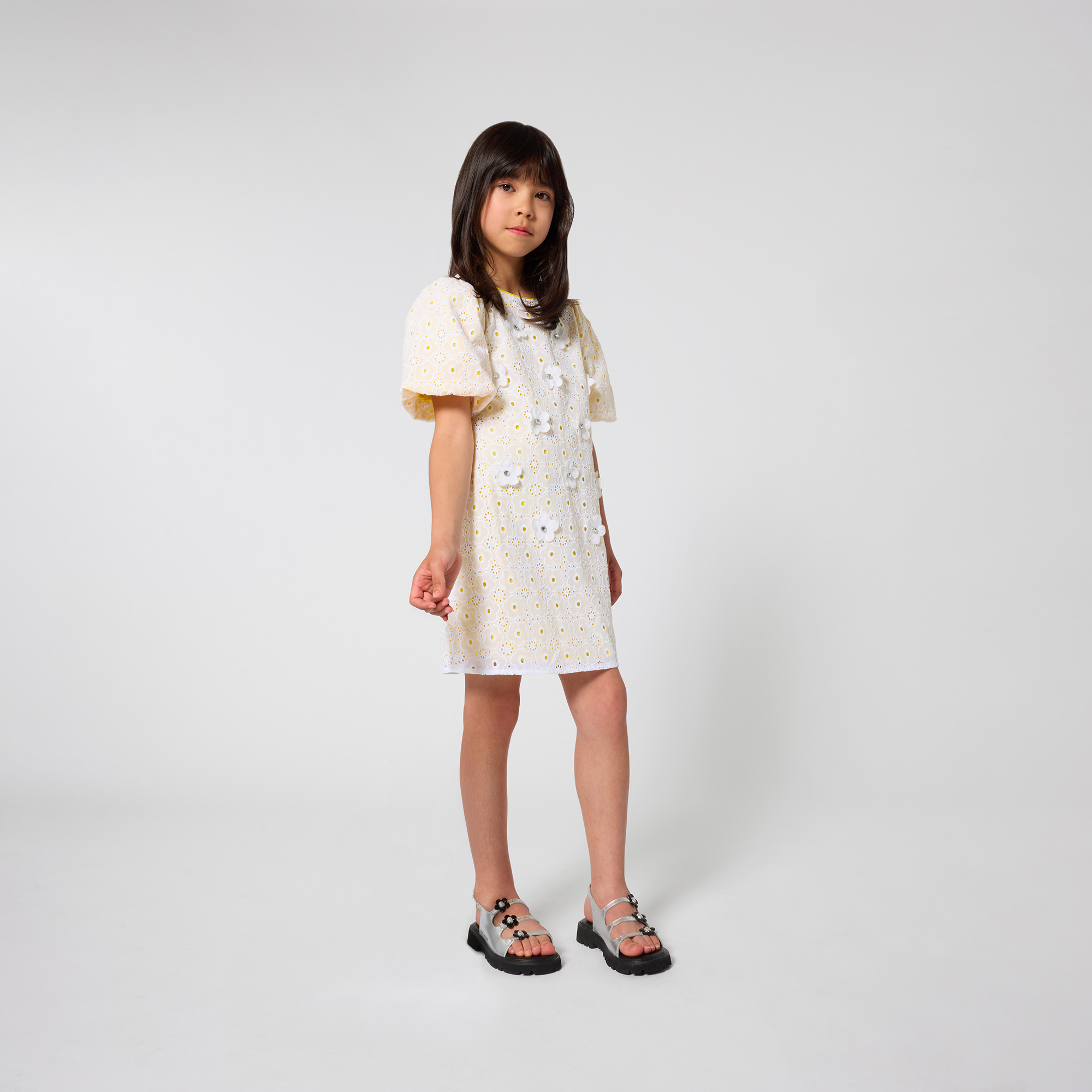 • Yellow dress with puff sleeves covered in white lace and small woven flowers.
