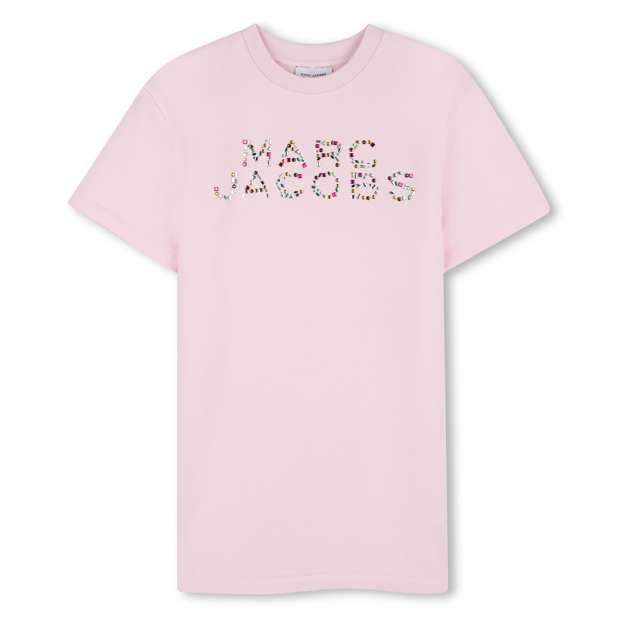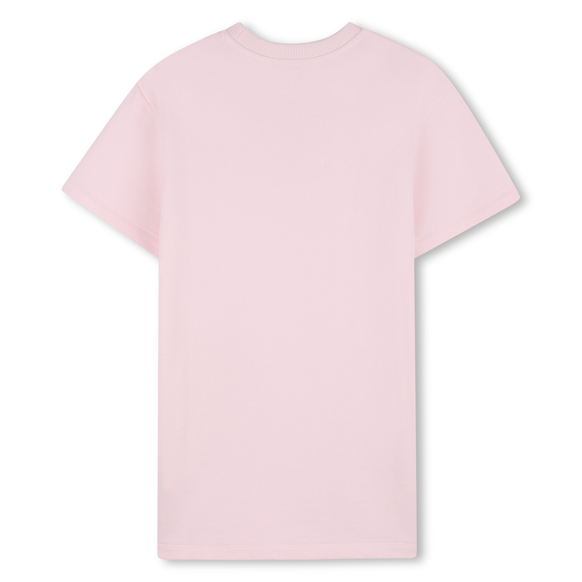 • Pink sweatshirt-style dress with short sleeves and a colorful stone logo on the front.