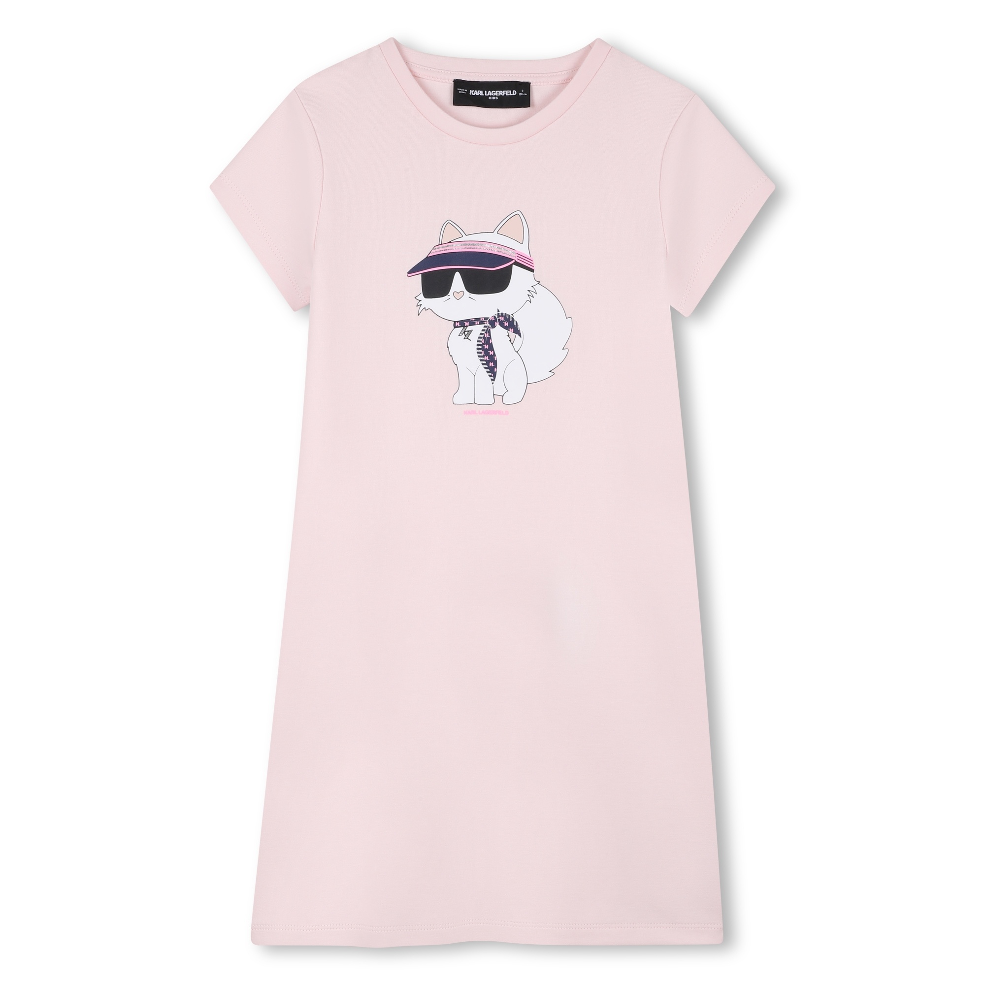 Short-sleeved black and white striped dress with small sequins on the front. Pink lettering on the front.