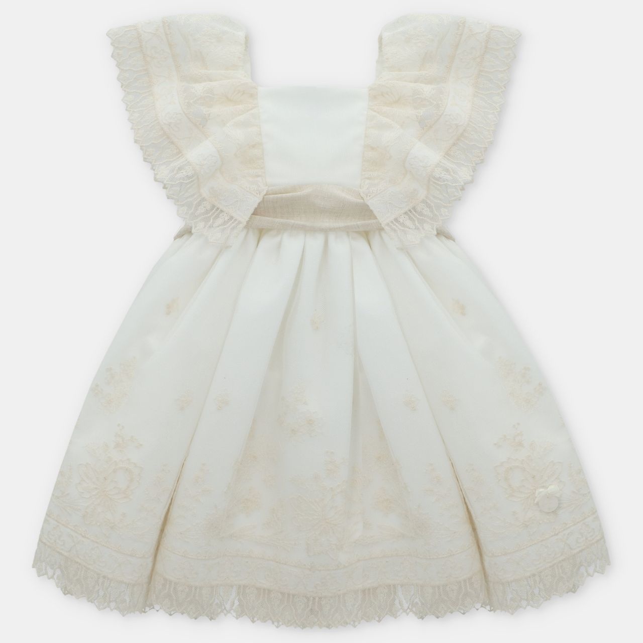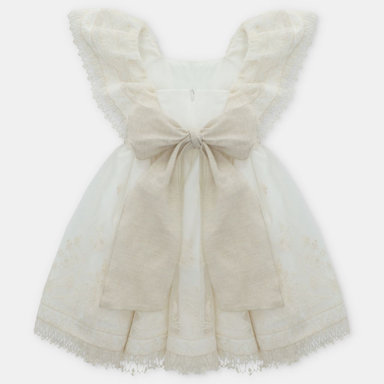 • Shell-colored short-sleeved dress trimmed with lace, featuring a pretty linen-colored ribbon and zipper closure at the back.