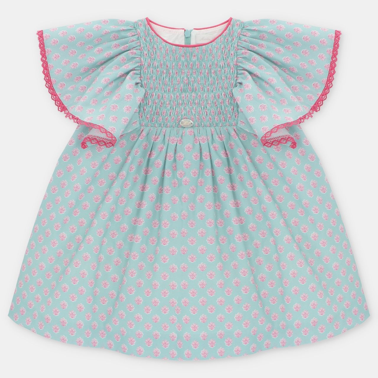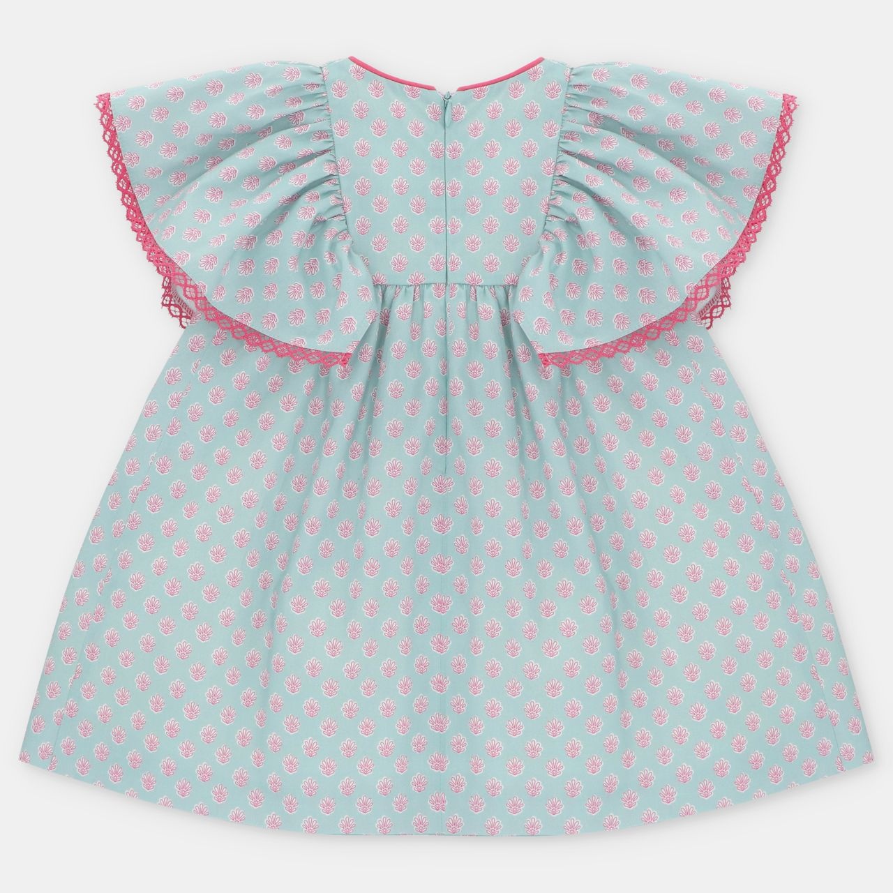 • Turquoise and pink printed dress with loose short sleeves and zipper closure at the back.