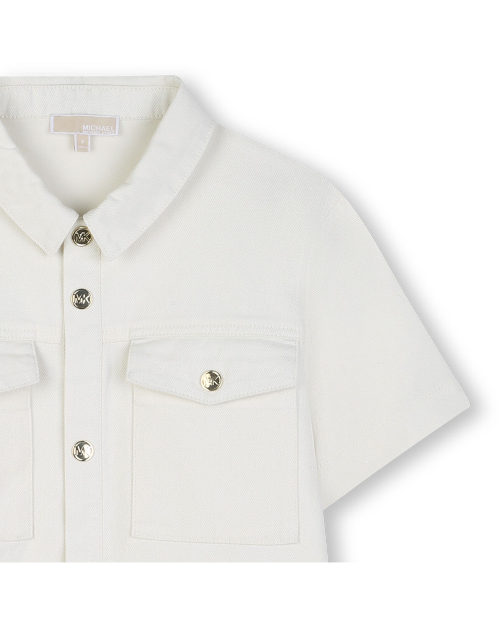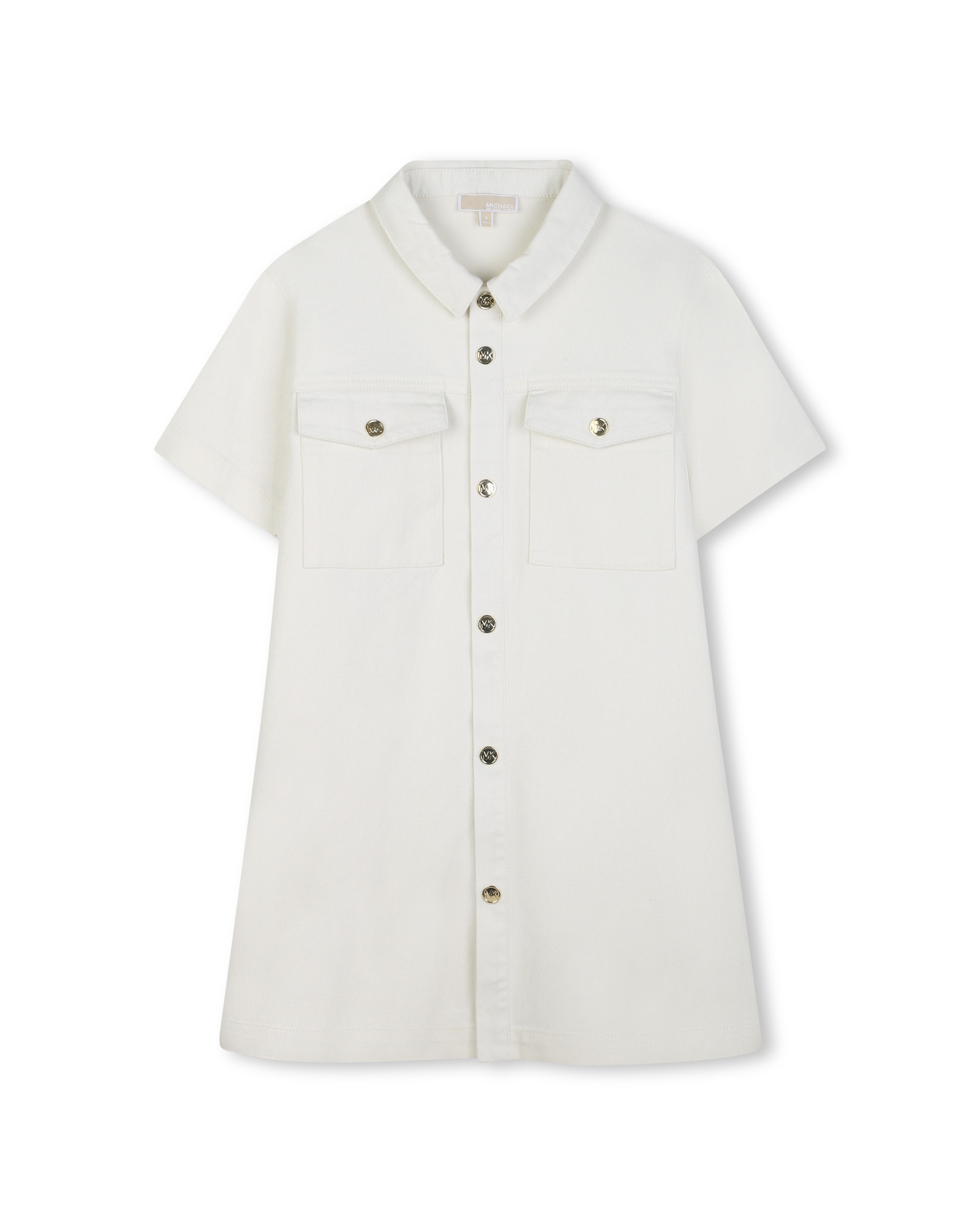 • White denim-style dress with gold button fastening and front pockets.