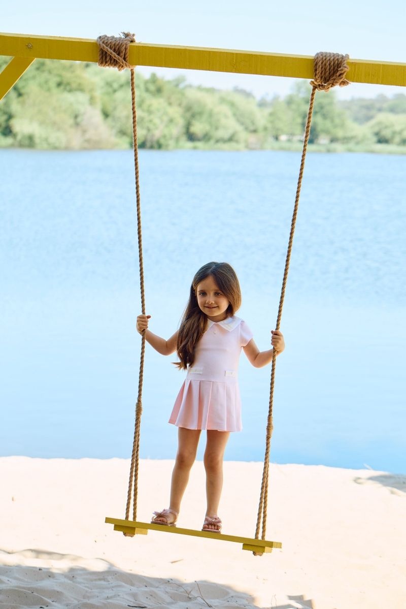 • Light pink short-sleeved dress with zipper at the back.
