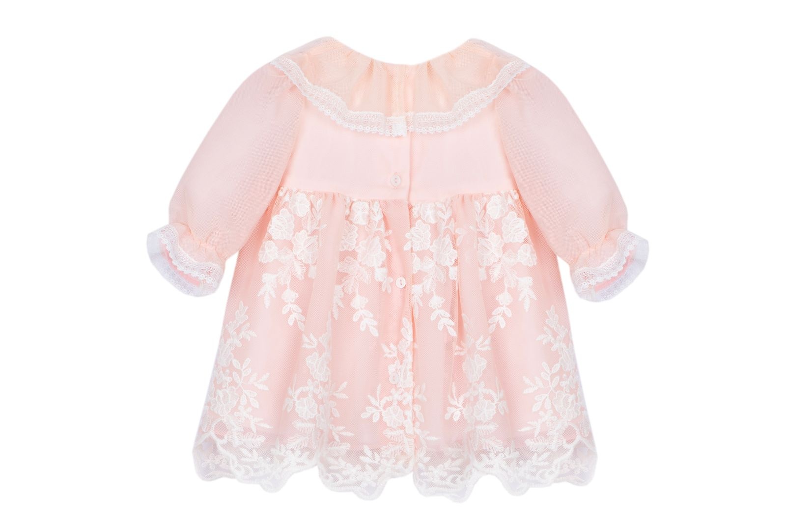 • Pink long-sleeved dress with button closures at the back.