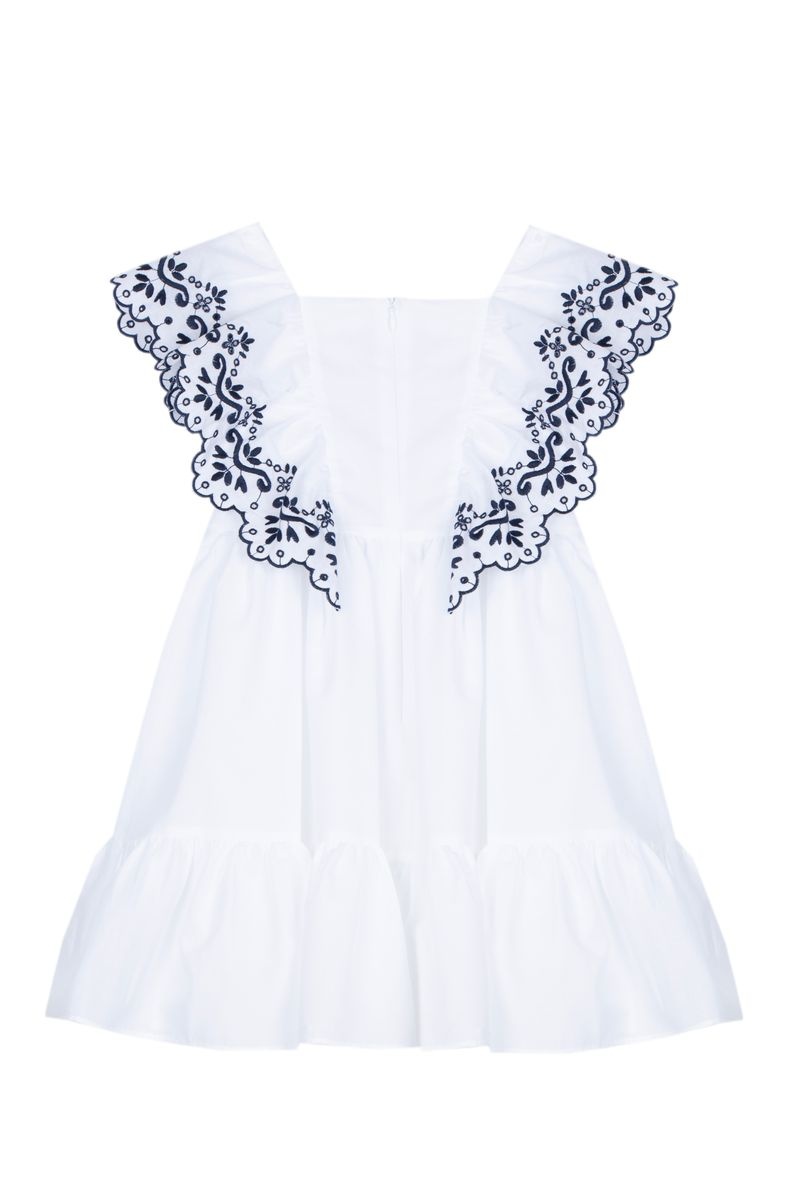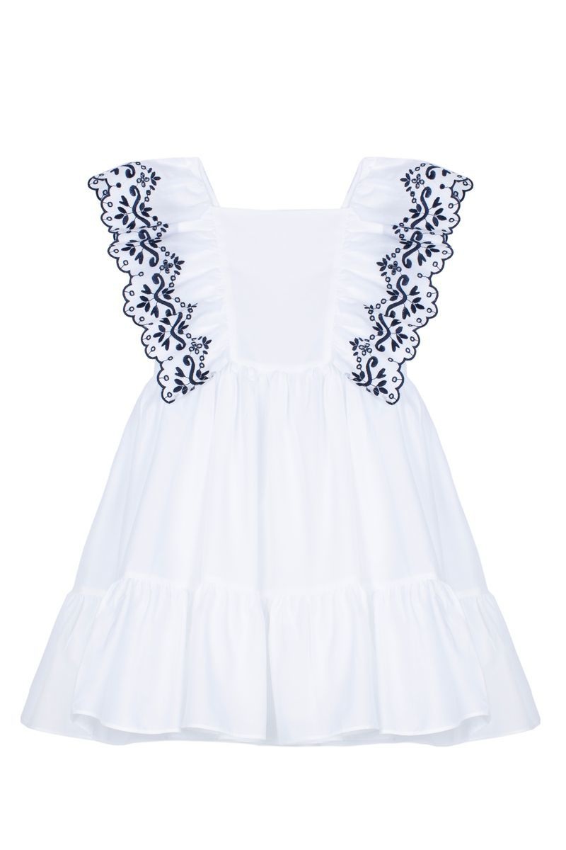 • White dress with navy embroidery.
