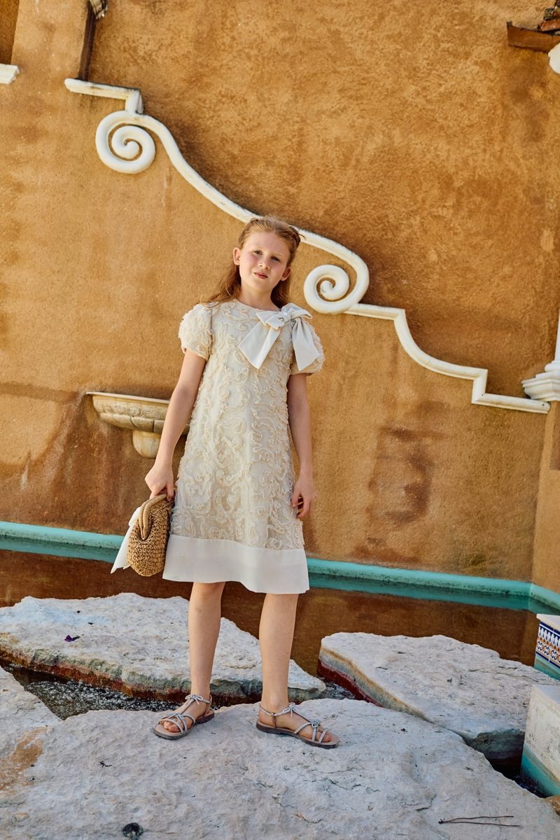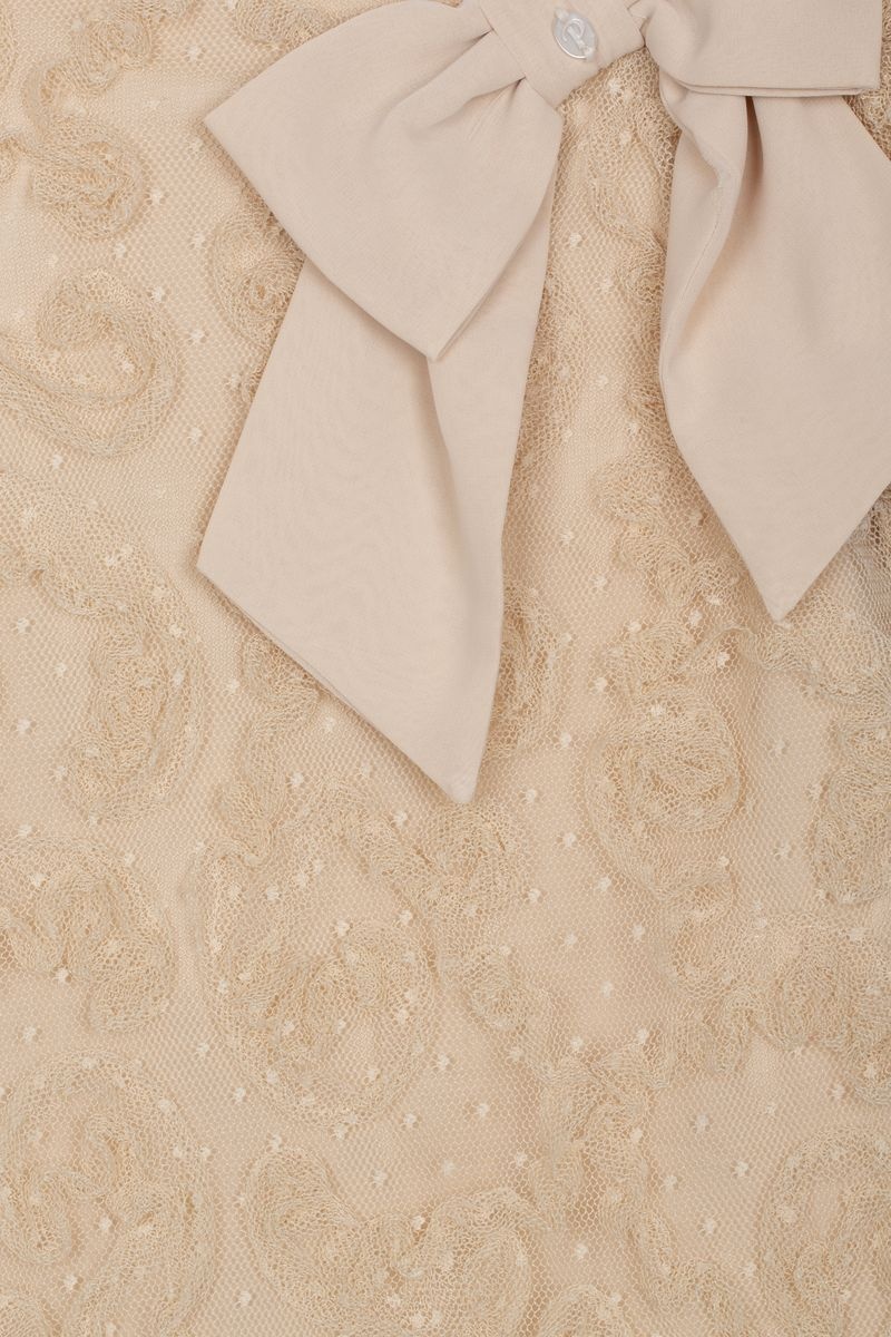 • Champagne-colored short-sleeved dress with zipper closure at the back.