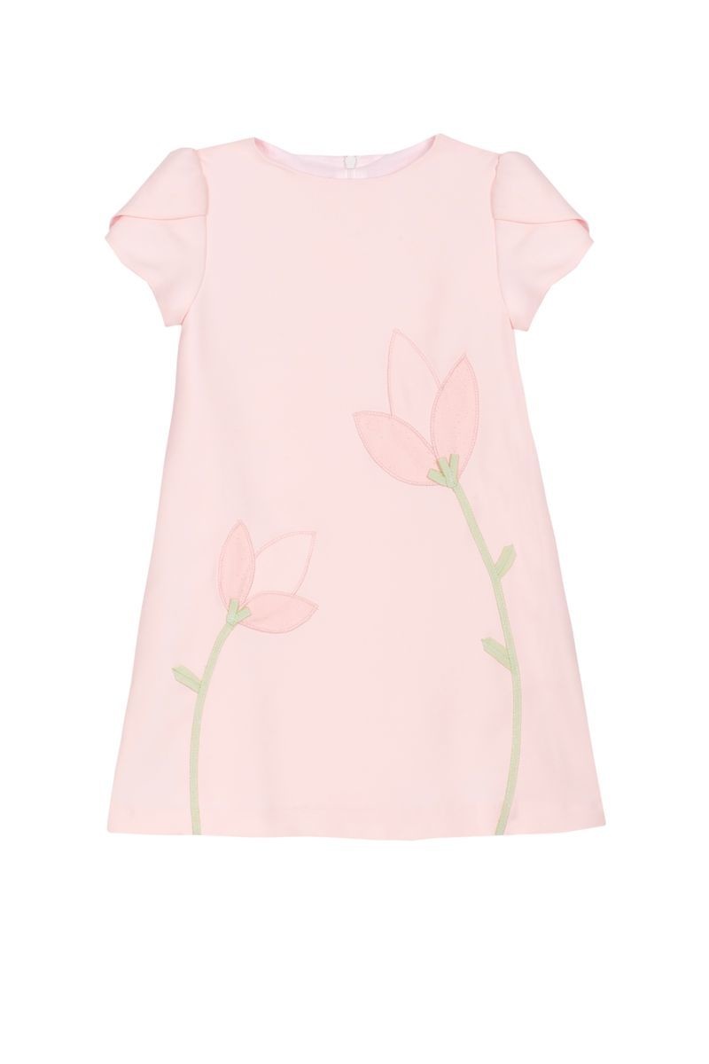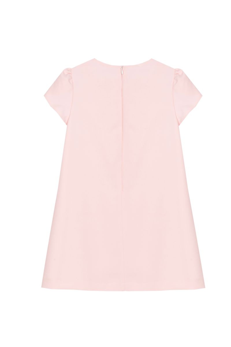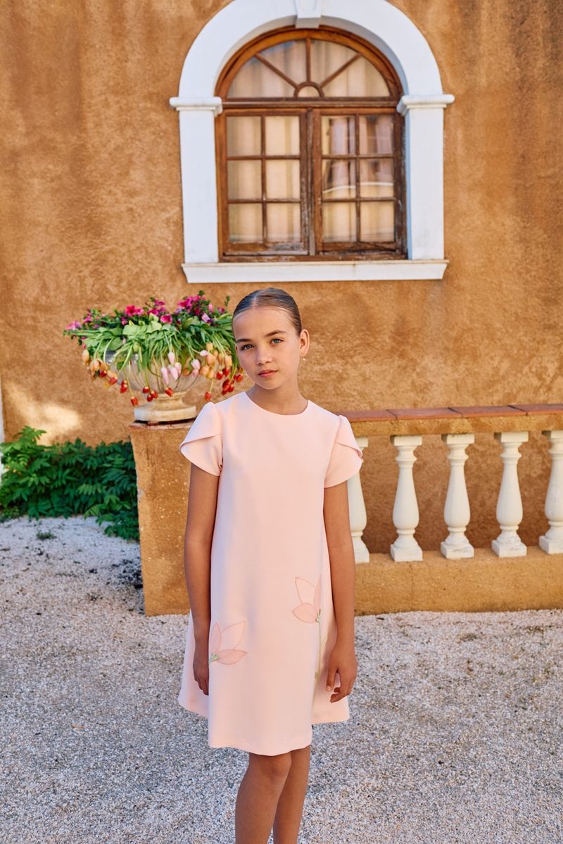 • Light pink dress with courtesy sleeves and zipper closure at the back.