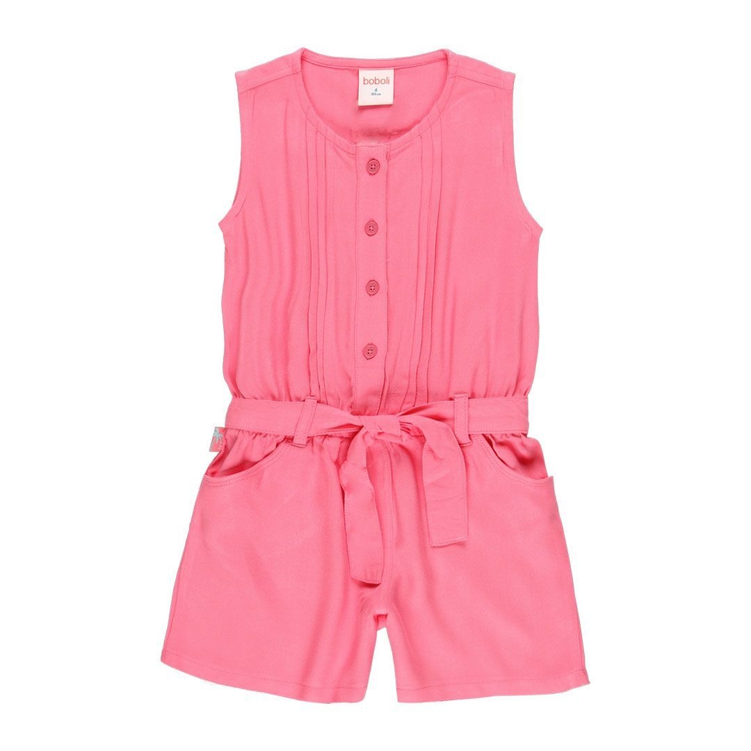 • Pink romper with a belted waist.