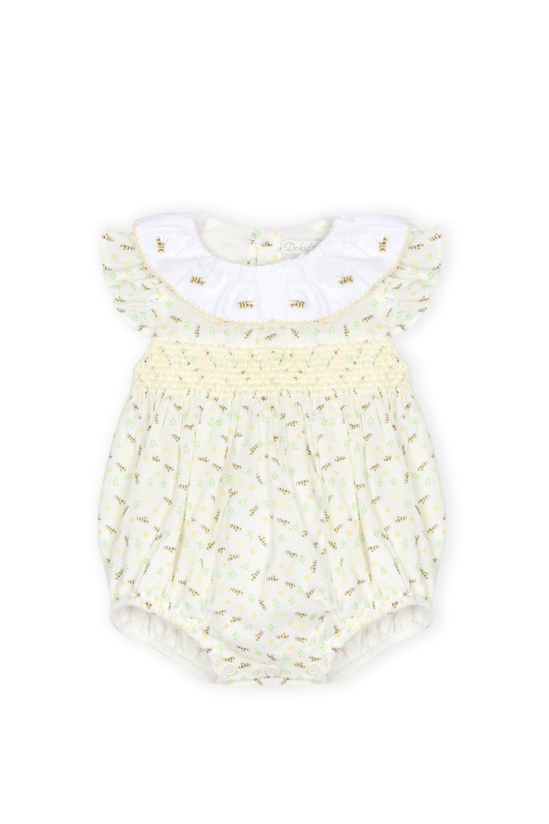 • Cream-colored printed romper with buttonholes at the back and snap buttons at the crotch.