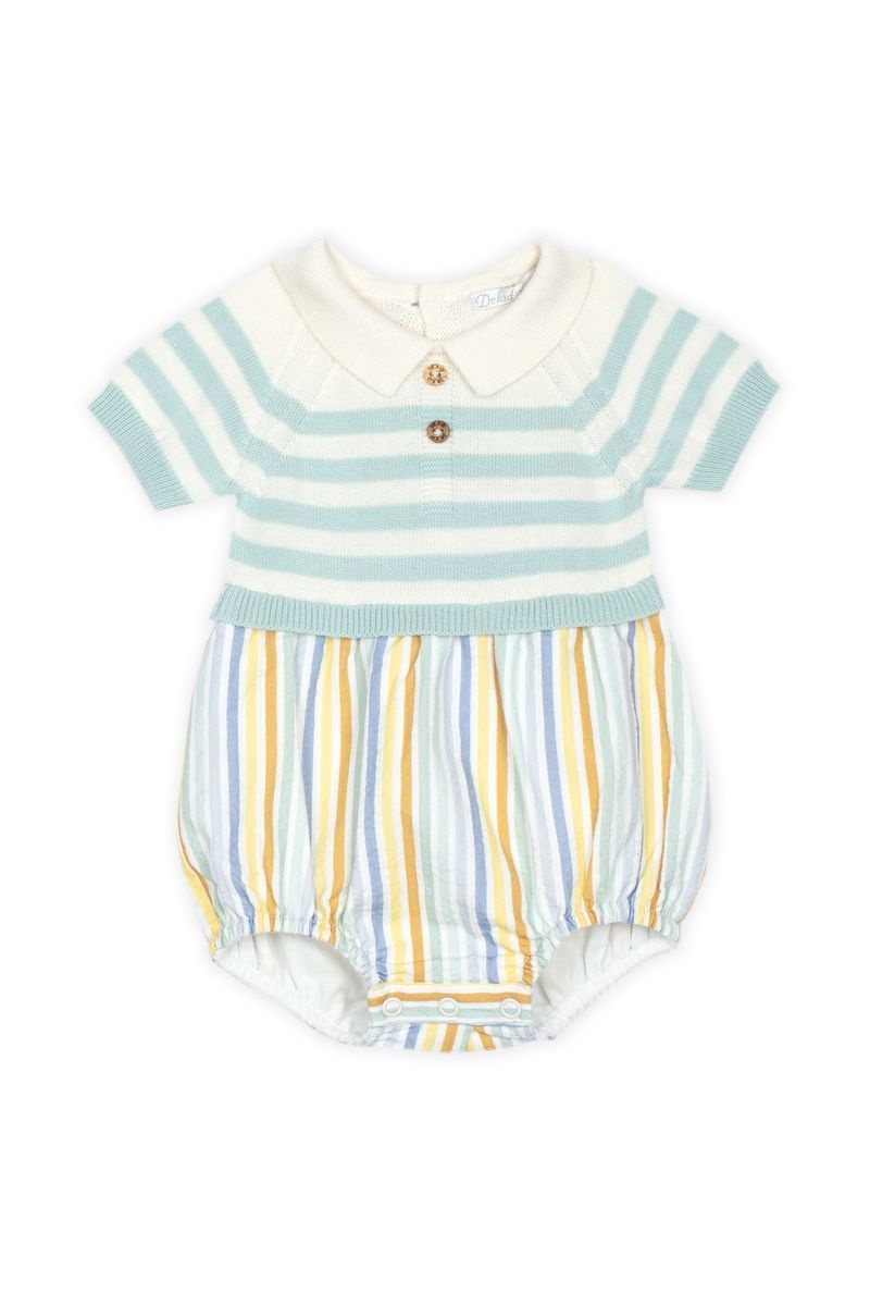 • Striped romper with buttonholes at the back and snap fasteners at the crotch.