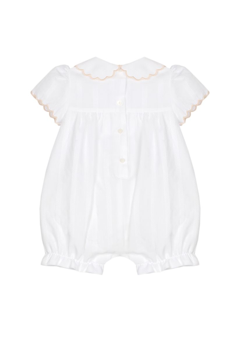 • Off-white romper with a pretty collar and button closure at the back and crotch.