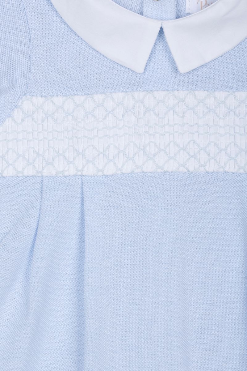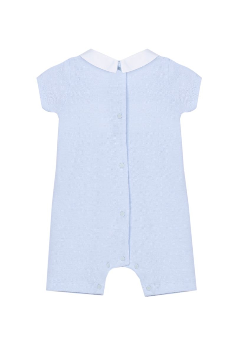 • Blue romper with a pretty collar and snap buttons at the back and crotch.