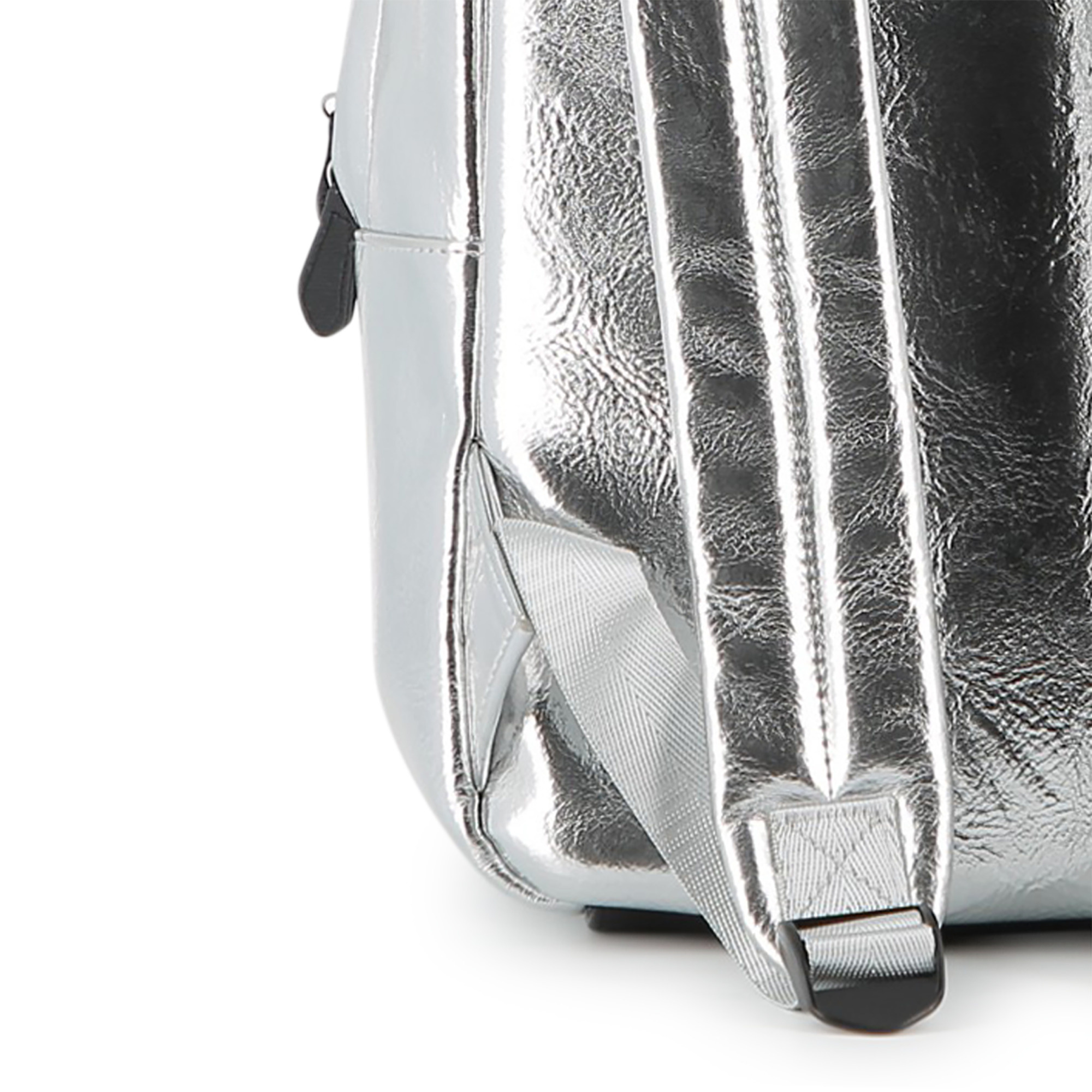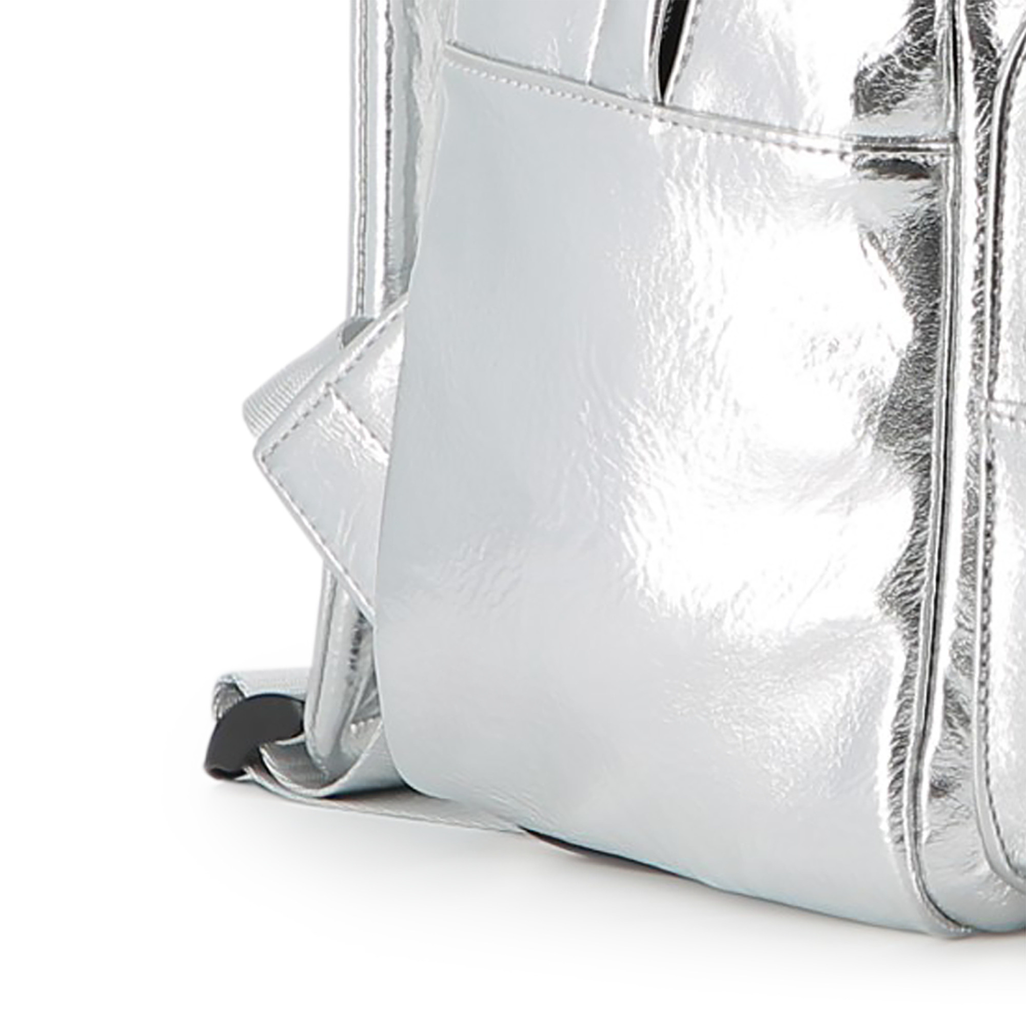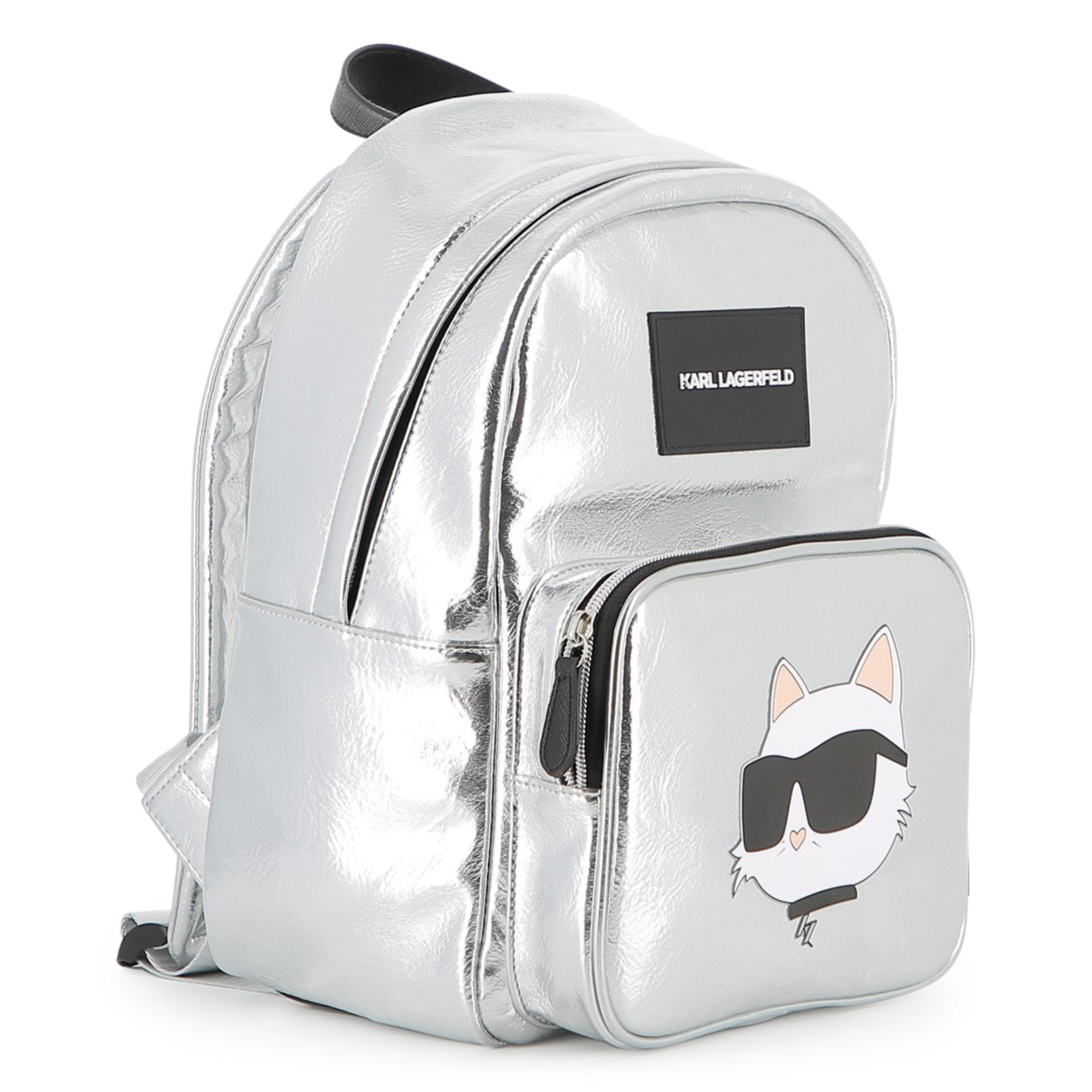 • Metallic gray backpack with a large front pocket and zip closure. Classic white kitten print on the front.